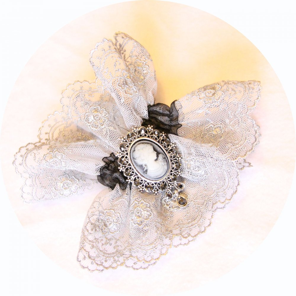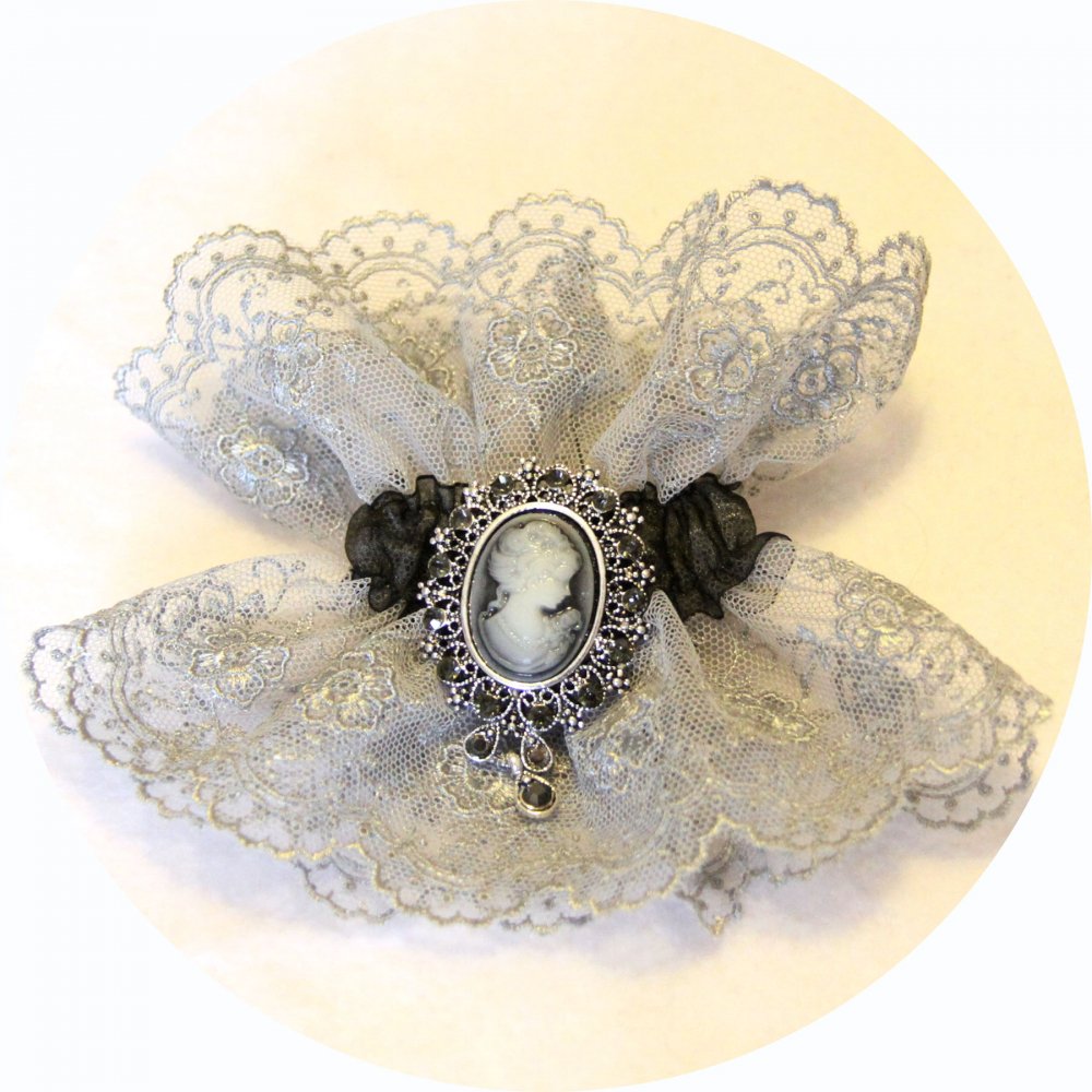 Pour ce bracelet j'ai choisi un tulle brodé gris perle, froncé sur un élastique en organza noir, et mis en valeur par une jolie broche camée gris sur monture argentée à strass.