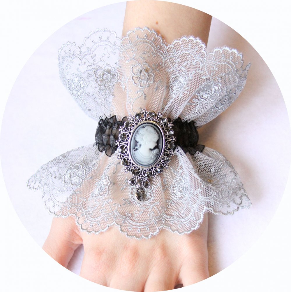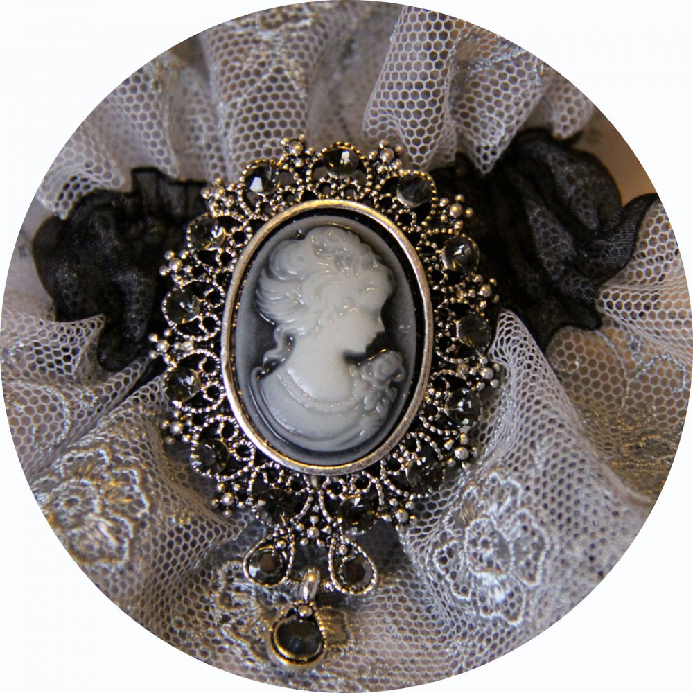 Bracelet manchette steampunk victorien en dentelle grise et noire et broche camée