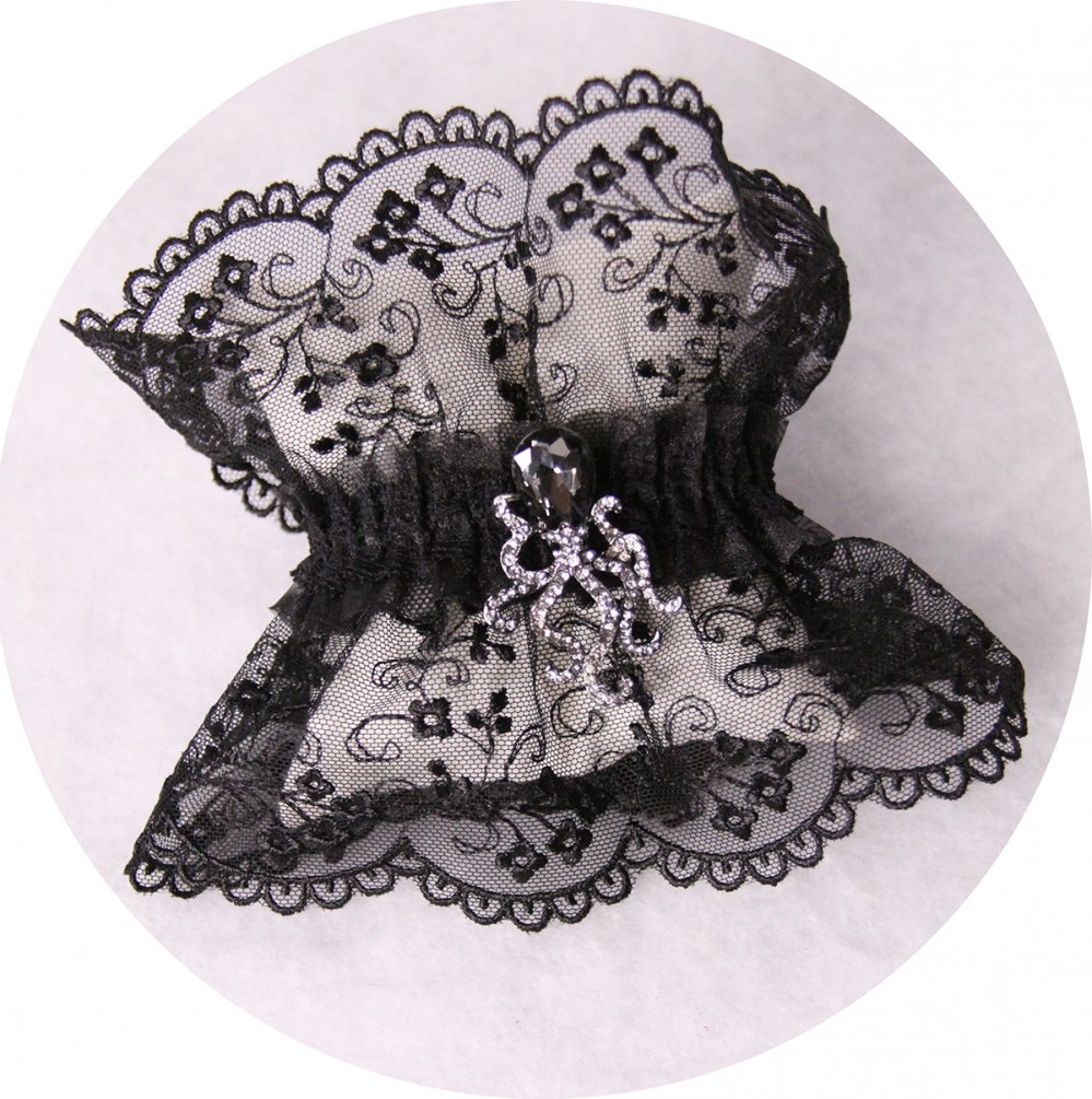 Bracelet manchette en dentelle noire et broche bijoux pieuvre. Cette manchette bijoux fait partie de ma collection de bijoux textiles. Pour ce bracelet j'ai choisi une dentelle noire, froncé sur un élastique, et mis en valeur par une jolie broche pieuvre en métal argenté strassé. Taille unique, pièce unique