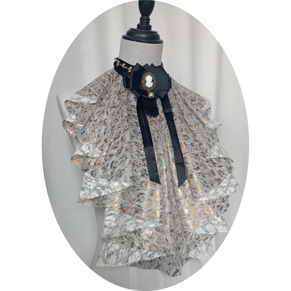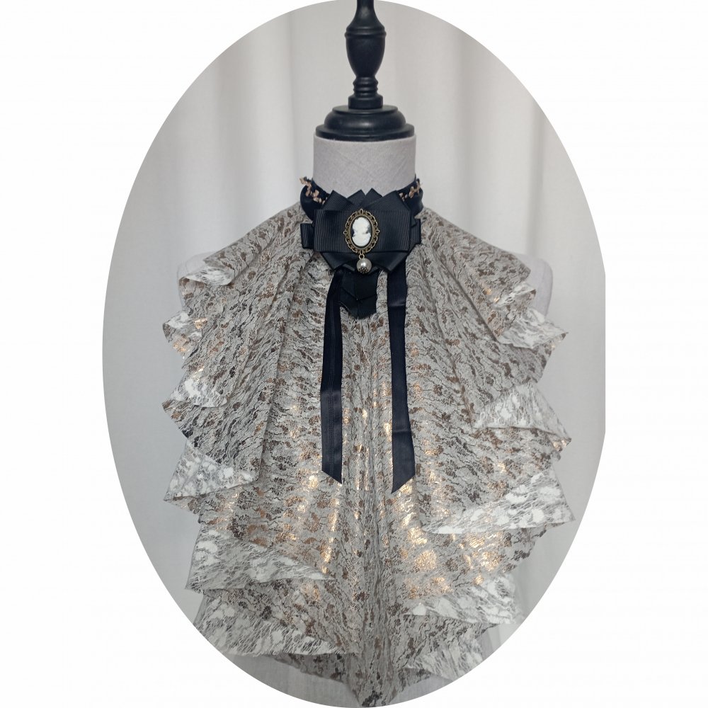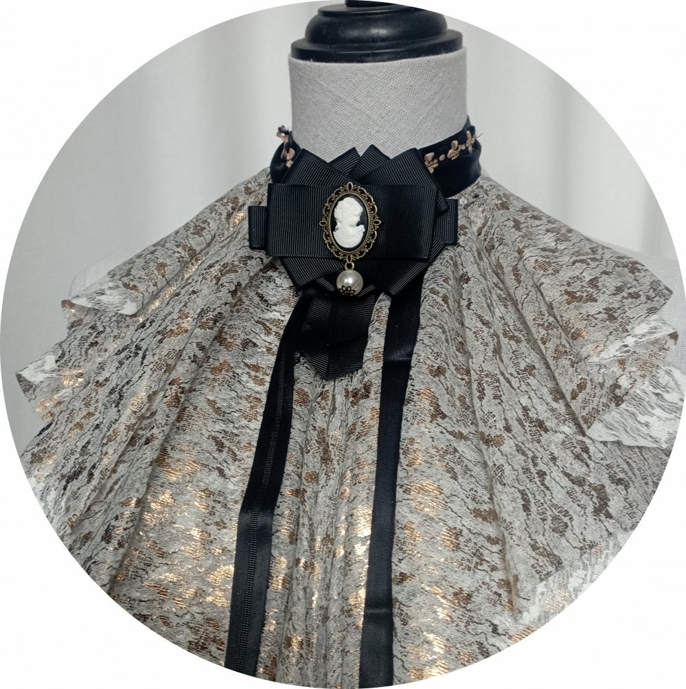 Pour ce col, j'ai choisi un belle dentelle icoire rehassé de touches dorées, et un ruban en satin écru pour le noeud. Une broche camée rehausse le col du jabot en dentelle.