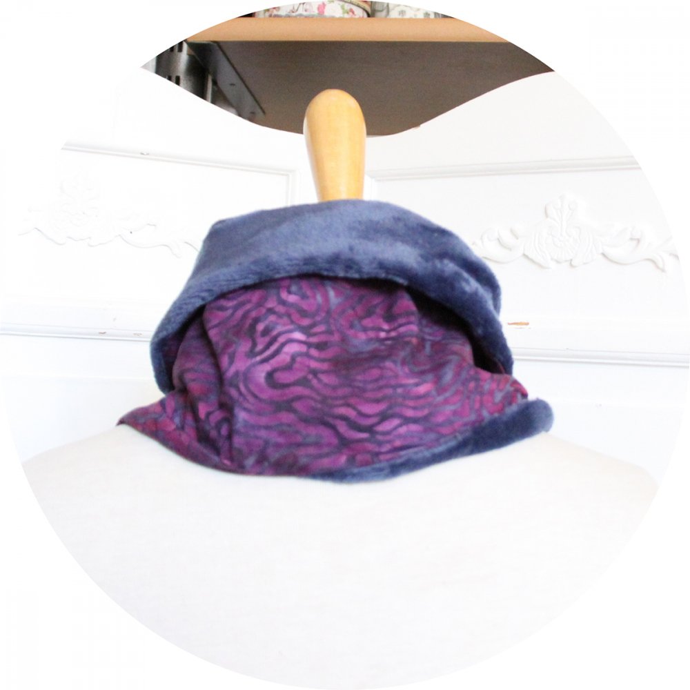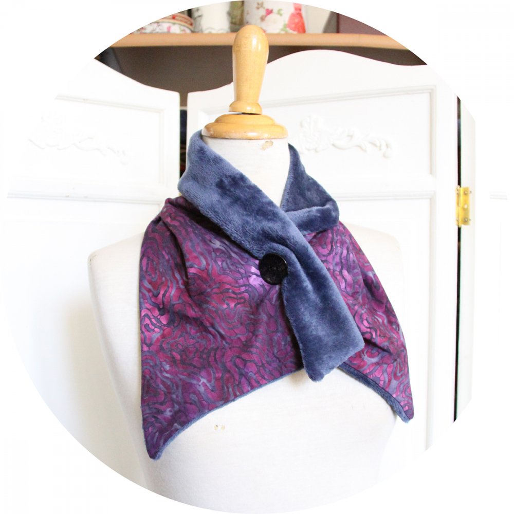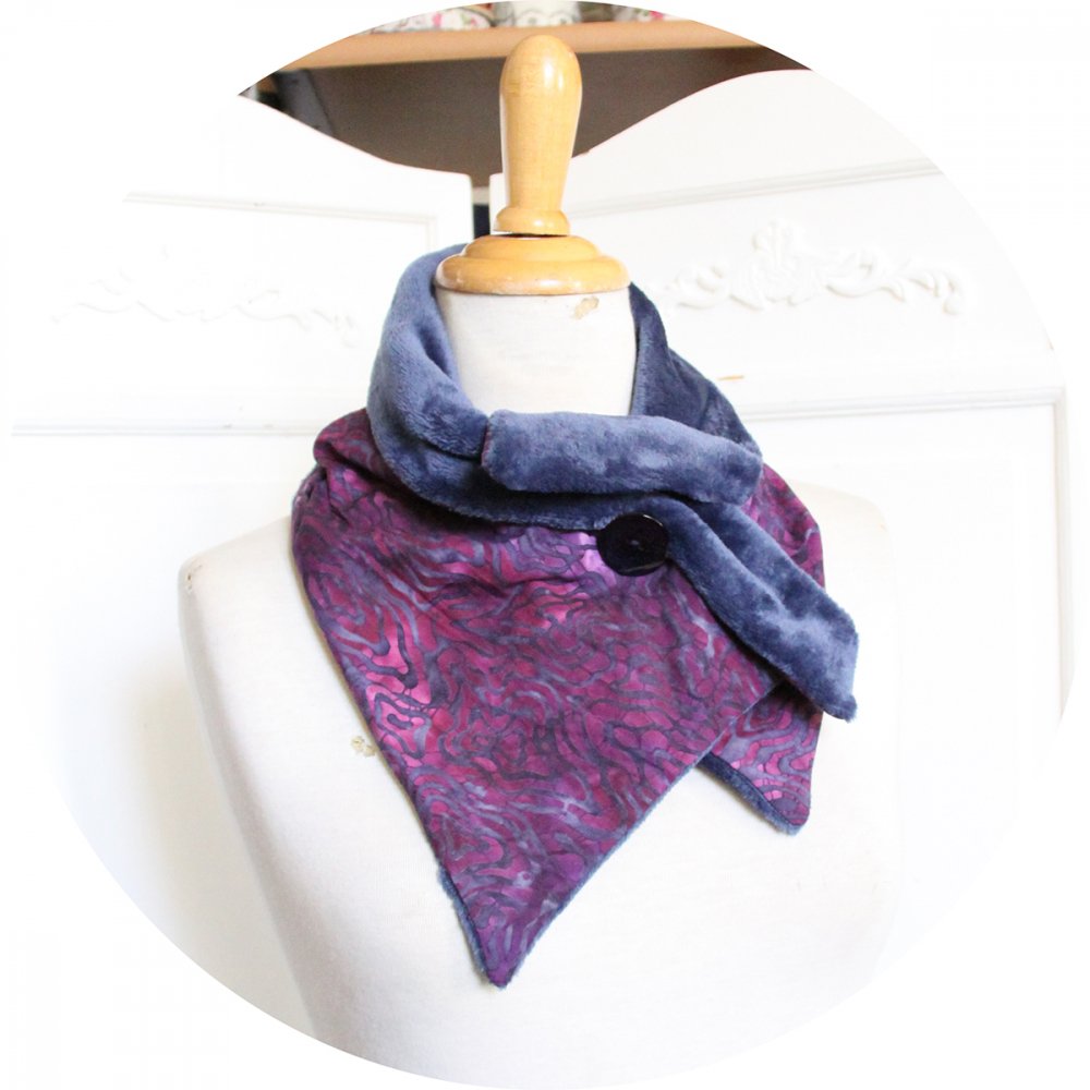 Un joli col écharpe ultra doux et souple coupé dans un coton batik bleu et mauve , tout doublé de fourrure polaire bleu jean.