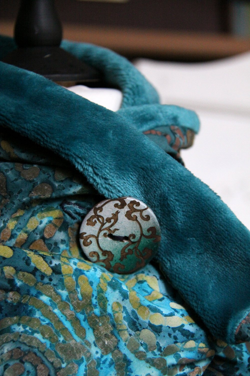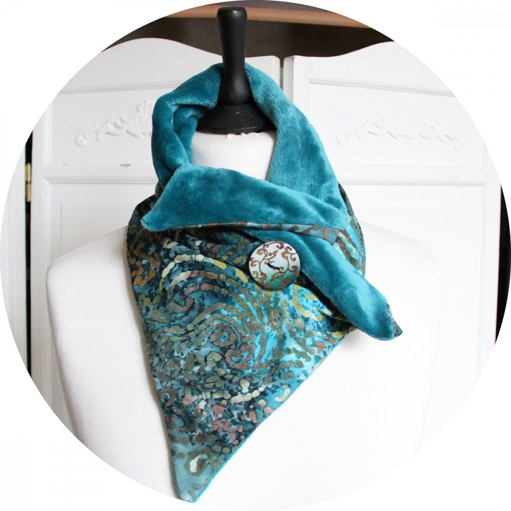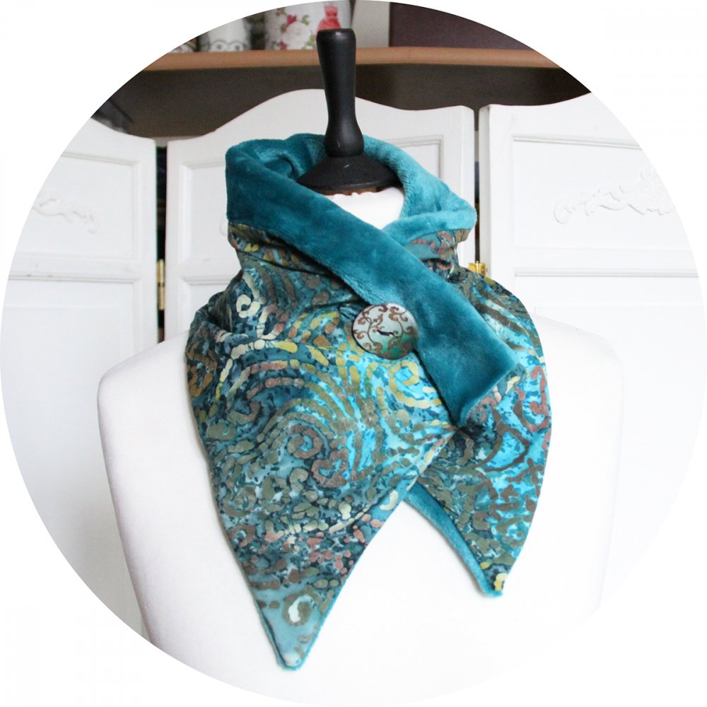Un joli col écharpe ultra doux et souple coupé dans un coton batik bleu vert , tout doublé de fourrure polaire bleu pétrole.