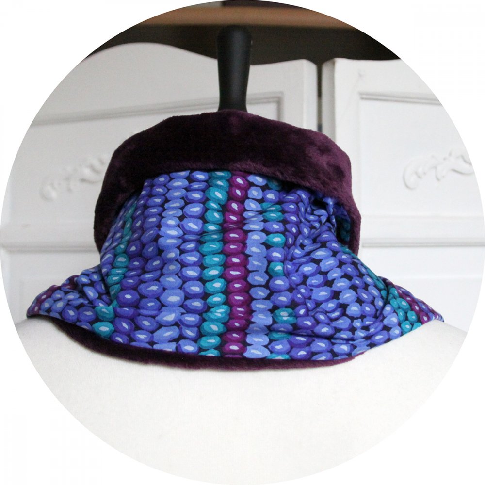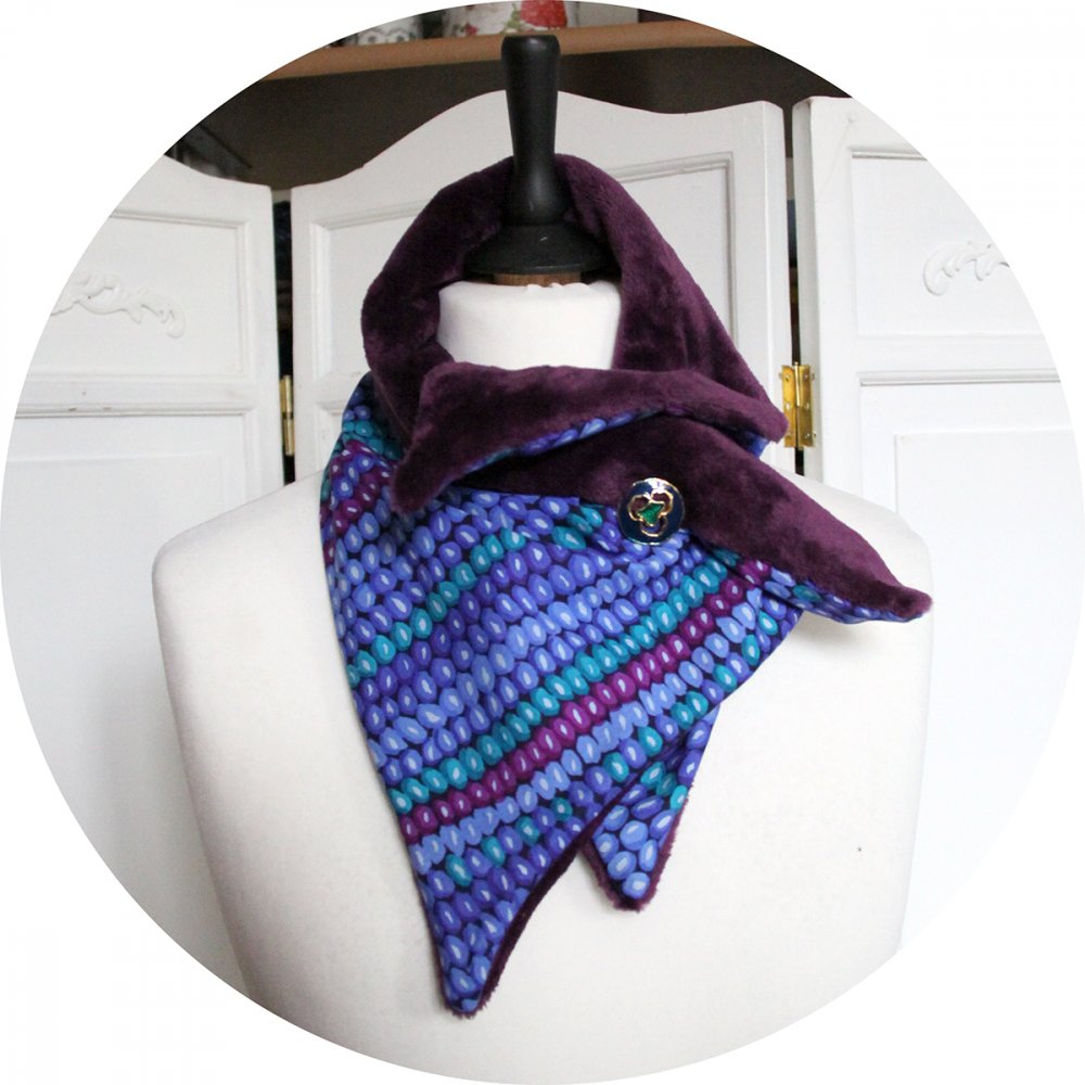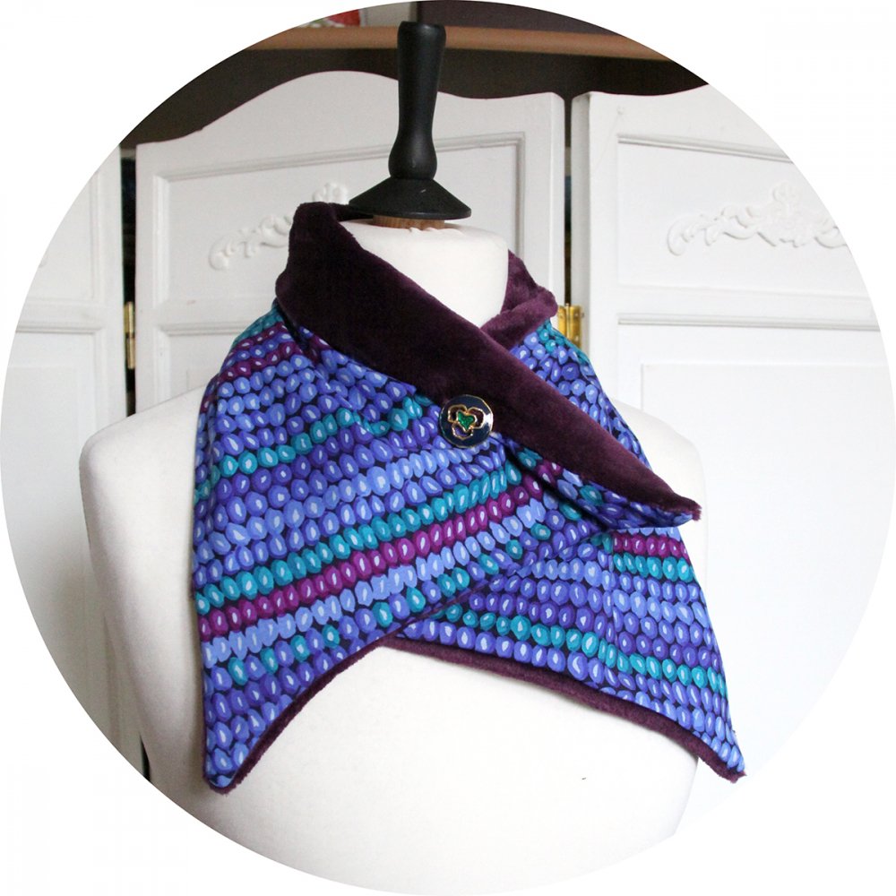 Col tour de cou en coton imprimé perlé bleu vert et intérieur polaire violet