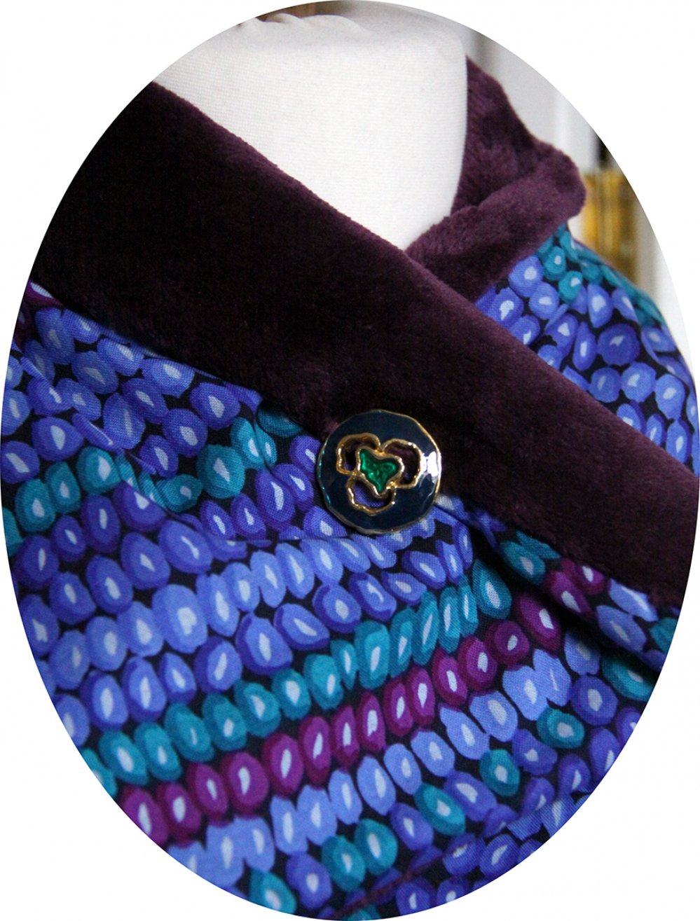 Col bleu vert et violet en coton imprimé d'un motif de perles et doublure polaire violet. Un joli col écharpe tout doux et souple coupé dans un imprimé coton. L'extérieur est en bleu vert et violet imprimé de rangs de perles en coloris bleu vert et violet, l'intérieur est en polaire ultra douce violette. Il se drape autour de votre cou pour vous tenir bien chaud et se ferme par un bouton émaillé bleu vert et doré.  Dimensions : 22cm de haut, 50 cm de tour une fois fermé