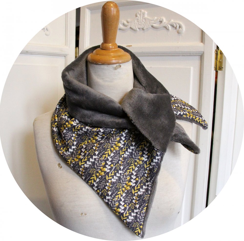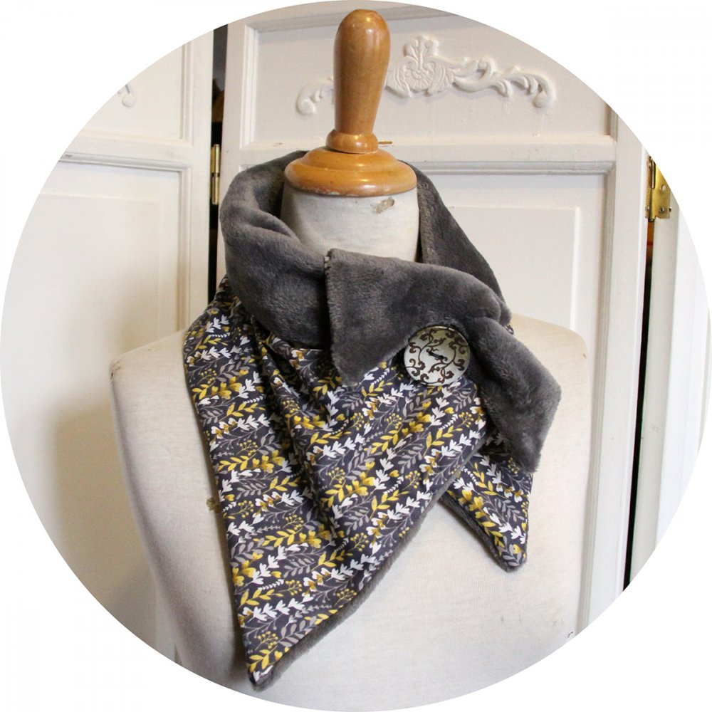 Col gris en coton imprimé jaune et blanc et fourrure polaire grise. Un joli col écharpe tout doux et souple coupé dans une toile de coton imprimée de feuilles blanches et jaunes sur fond gris, tout doublé de fourrure polaire grise super douce.. Il se drape autour de votre cou pour vous tenir bien chaud et se ferme par un bouton en bois de coco gravé. Une idée cadeau que vous plébiscitez parce que: