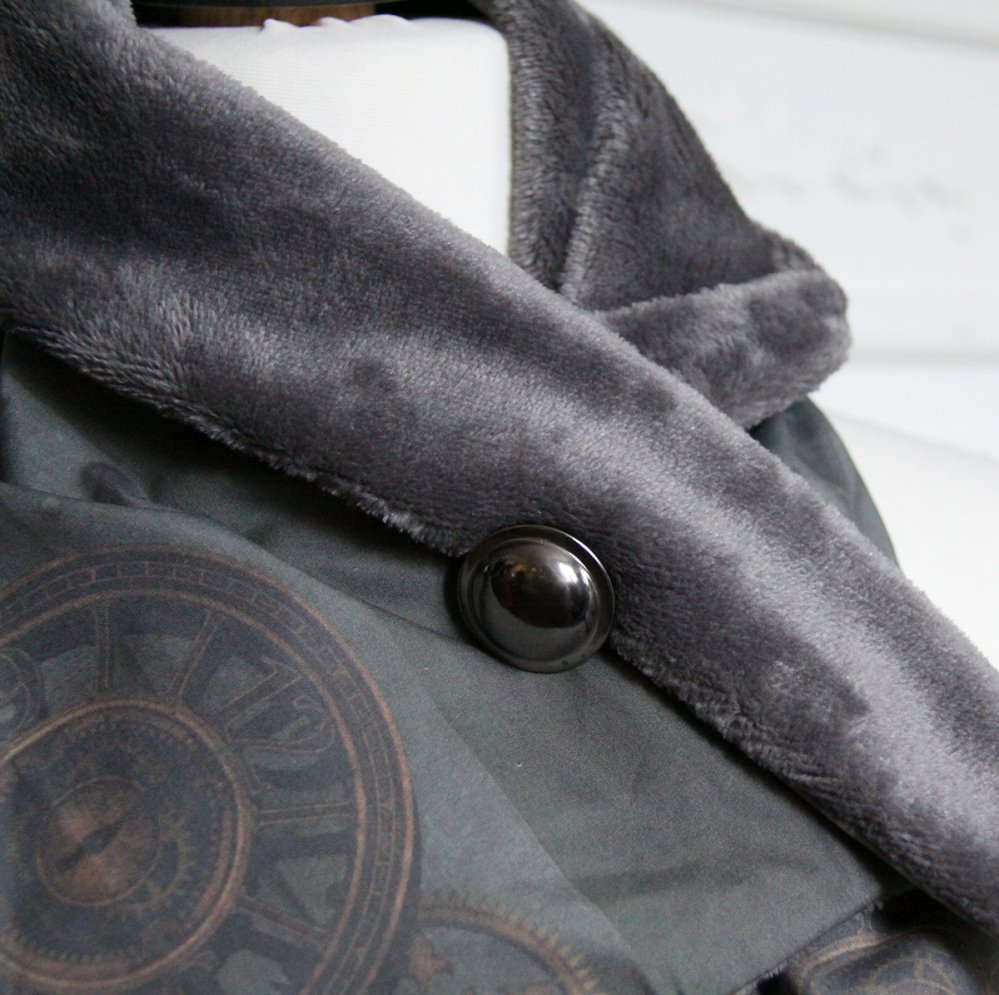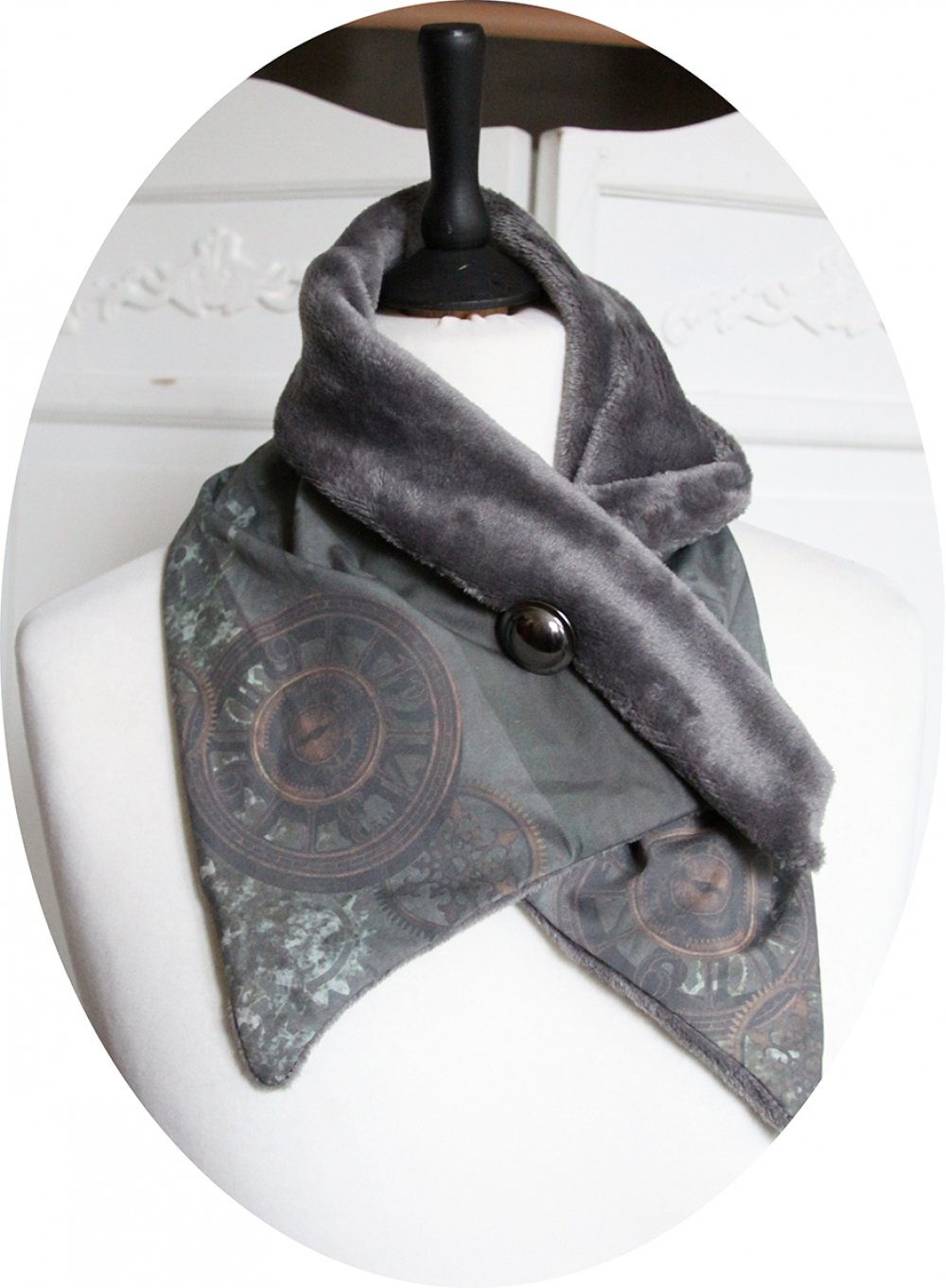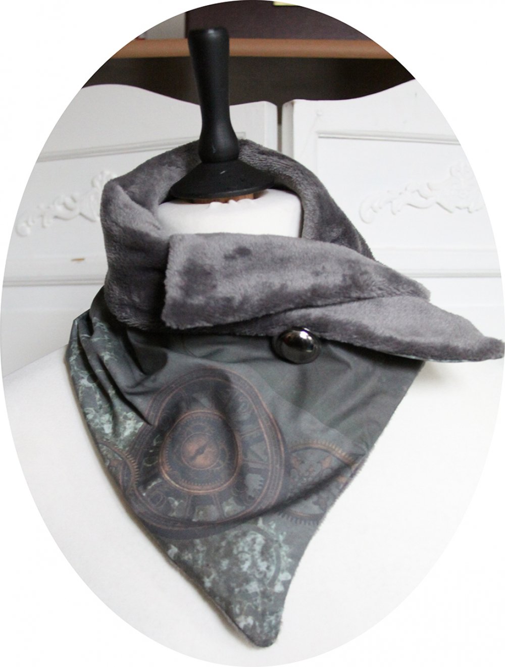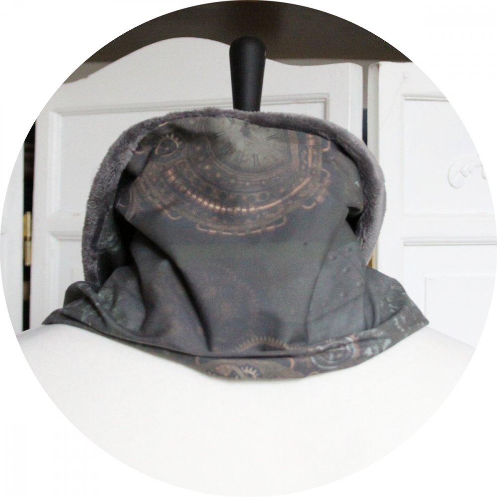 Un joli col écharpe tout doux et souple coupé dans une toile de coton imprimé de motifs d'horloges dans un style Steampunk, tout doublé de fourrure polaire grise super douce..