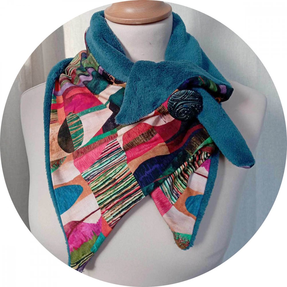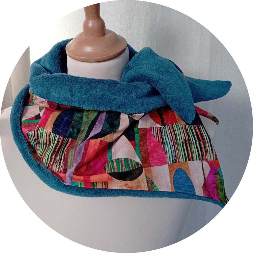 Col bleu vert en jersey de coton imprimé et fourrure polaire bleue. Un joli col écharpe ultra doux et souple coupé dans un jersey coton coloré, tout doublé de fourrure polaire bleu vert. Il se drape autour de votre cou pour vous tenir bien chaud et se ferme par un grand bouton en bois de polymère, fait maison. Dimensions : 33cm x 74cm