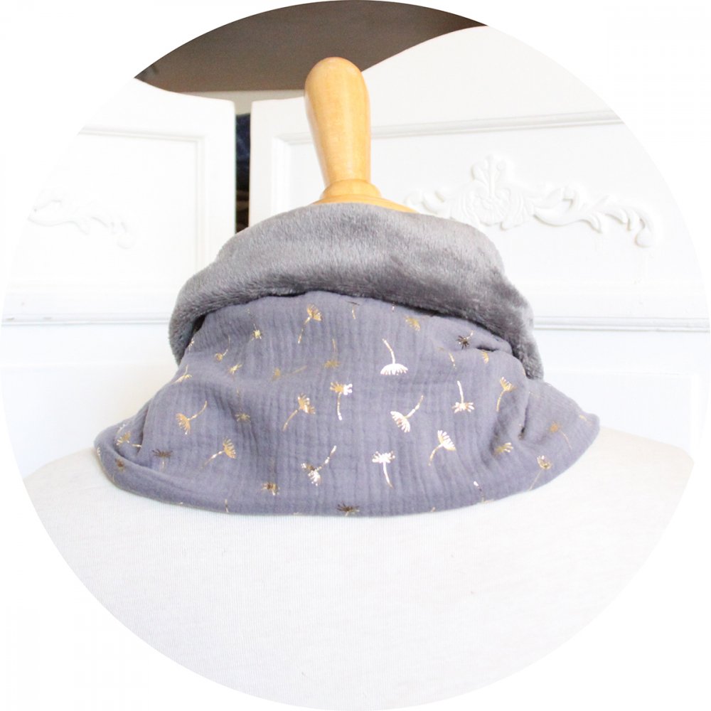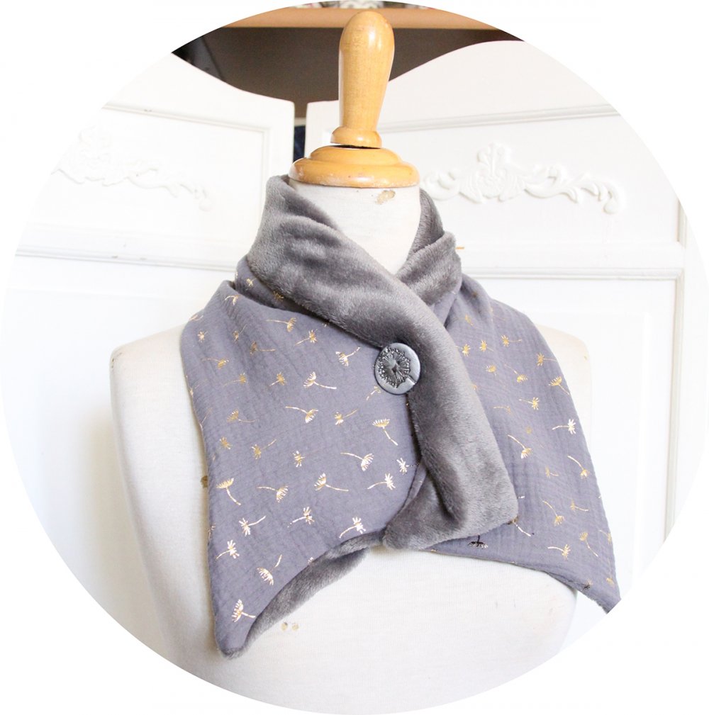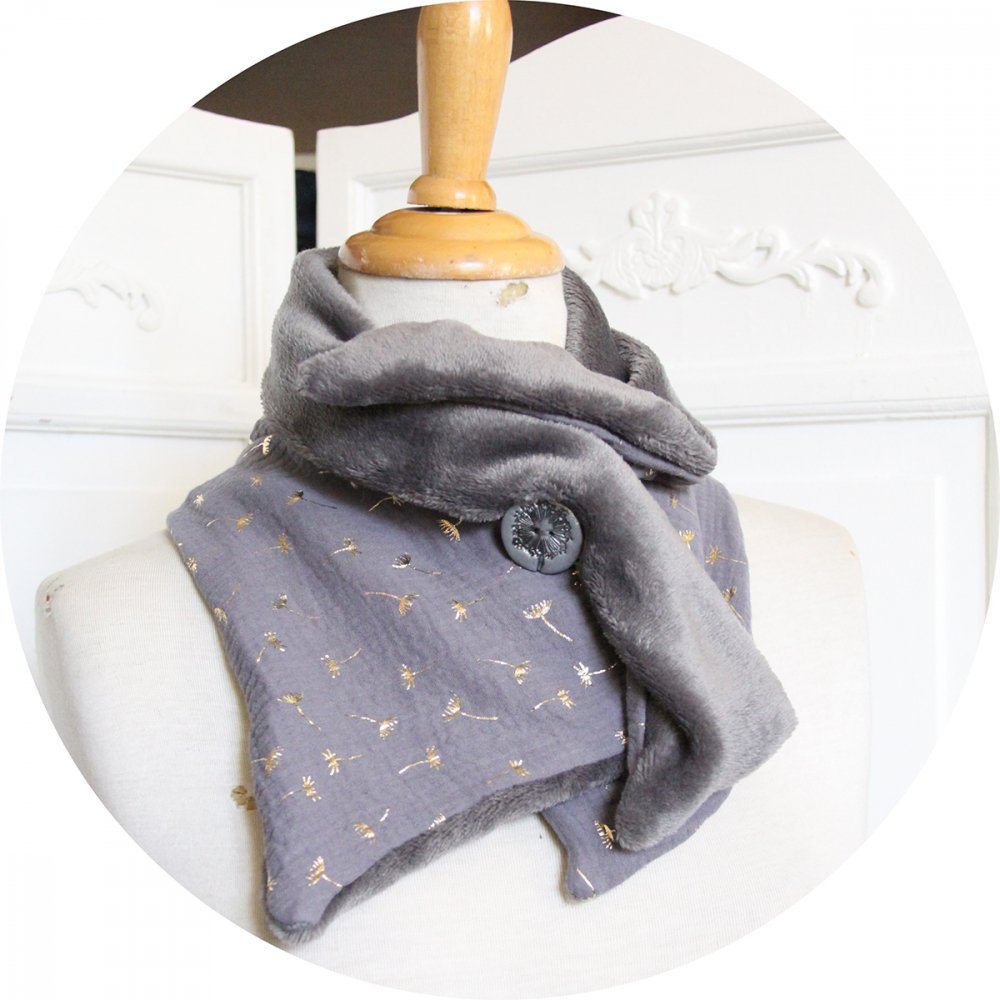 Col écharpe gris et doré en coton imprimé de pissenlits dorés et fourrure polaire grise.