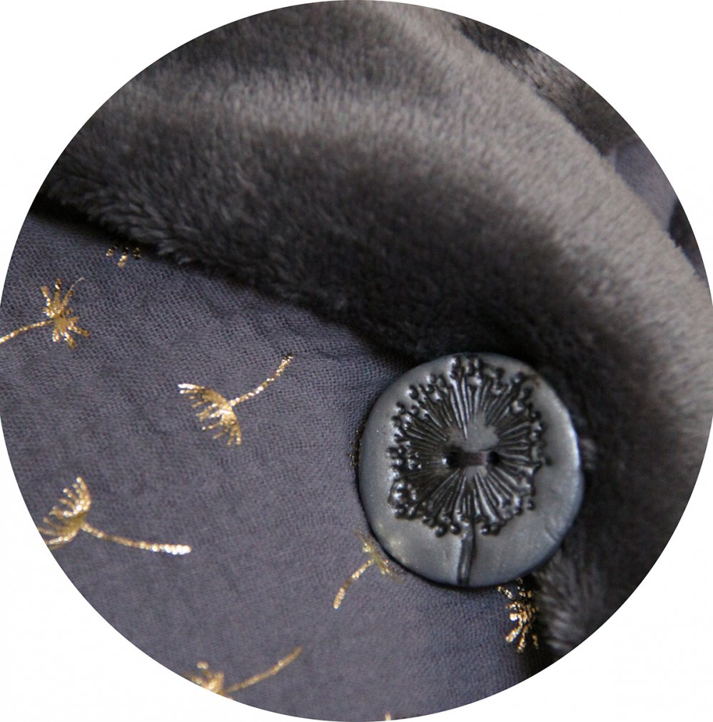 Il se drape autour de votre cou pour vous tenir bien chaud et se ferme par un bouton argenté à motif de pissenlit réalisé par mes soins.