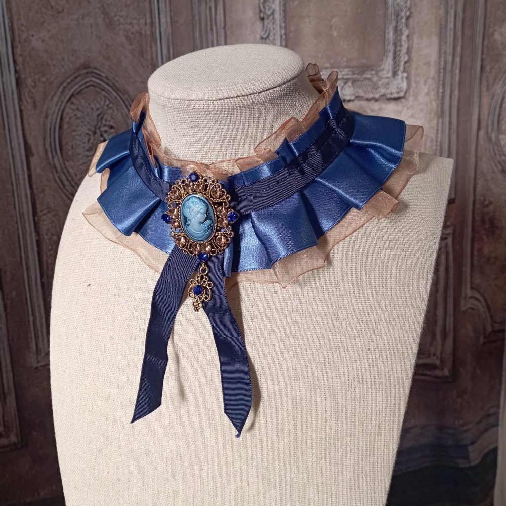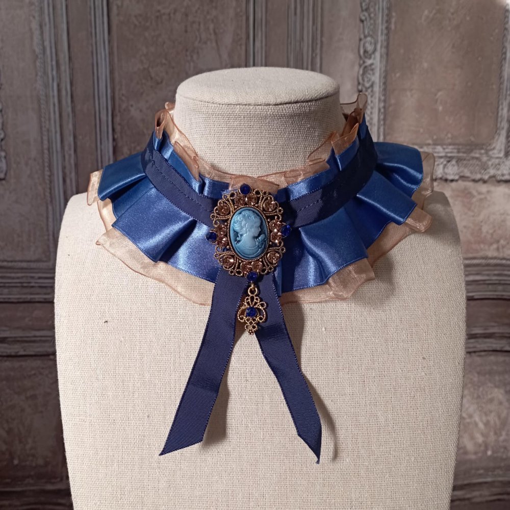 Collier tour de cou en ruban de satin bleu et broche strassée bleu et doré. Un col romantique et rétro pour ajouter une touche élégante à vos tenues Victoriennes, XVIIIe, Steampunk... Ce collier ras du cou est composé d'un large ruban de satin bleu et d'un ruban d'organza doré, travaillés en plissé ruché. J'y ai ajouté, sur le dessus, un ruban gros grain bleu. Une broche bronze strassée de bleu et doré orne le devant du collier. Un ruban en satin bleu permet de nouer le collier à la taille de votre cou.