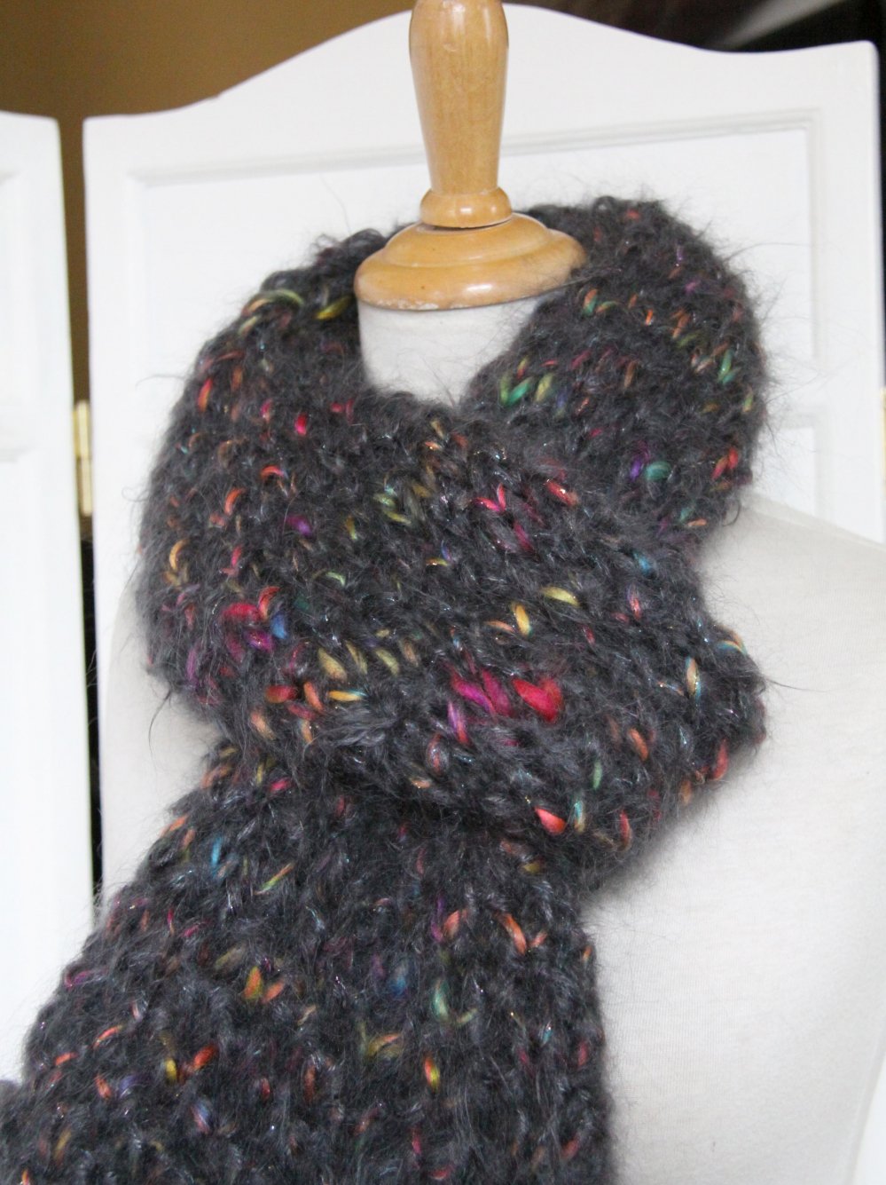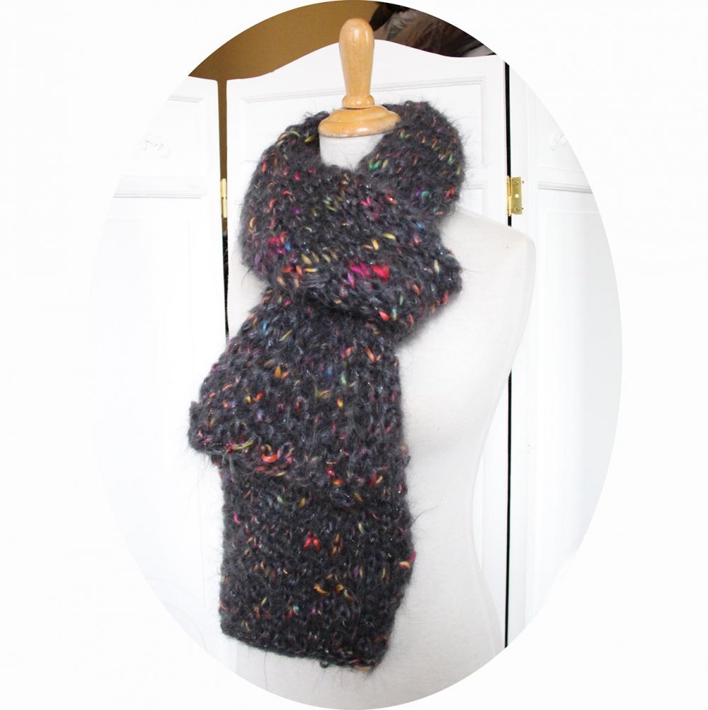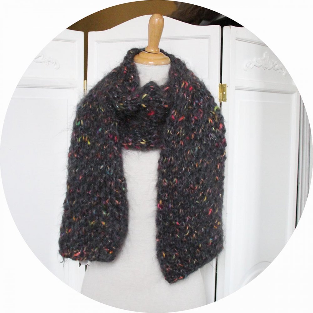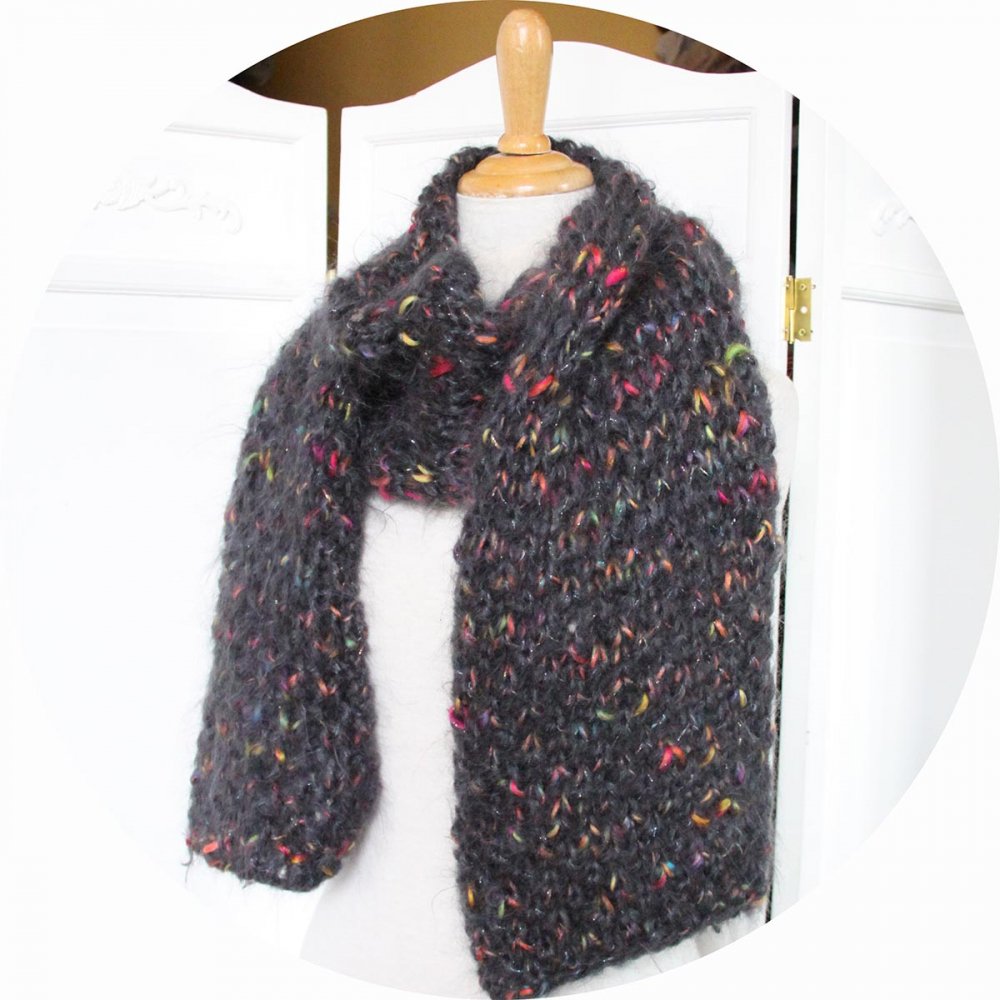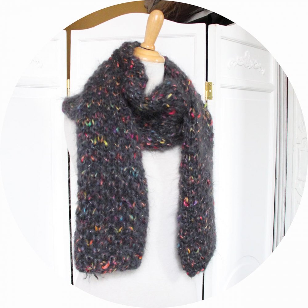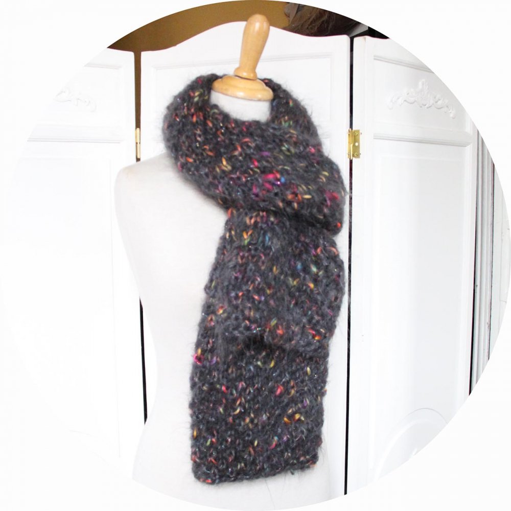 Écharpe grise tricotée à la main en laine mohair et fil fantaisie multicolore.