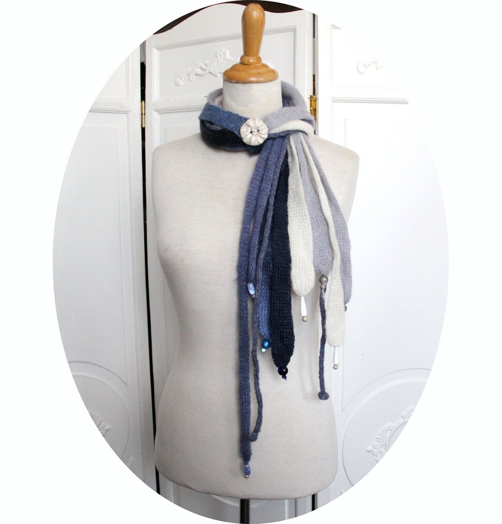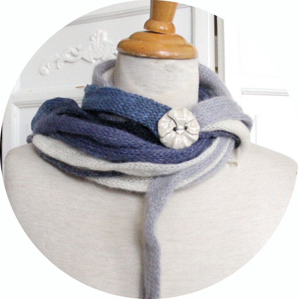 Pour ce modèle, j'ai associé un fil de laine shetland bleu, du mohair blue ciel et écru, de la laine bleu marine. L'extrémité des liens passe dans la boucle prévue cet effet pour venir se nicher au creux de votre cou.