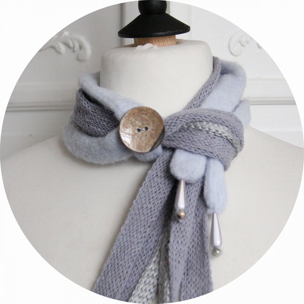 Echarpe multirangs bleu ciel, bleu porcelaine et gris perle en liens de laine tricotés, ornés de perles et d'un grand bouton en bois de coco gris beige.