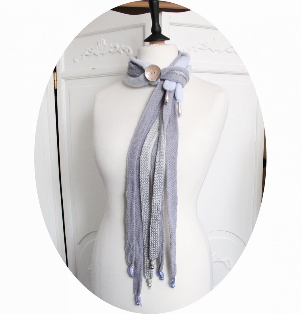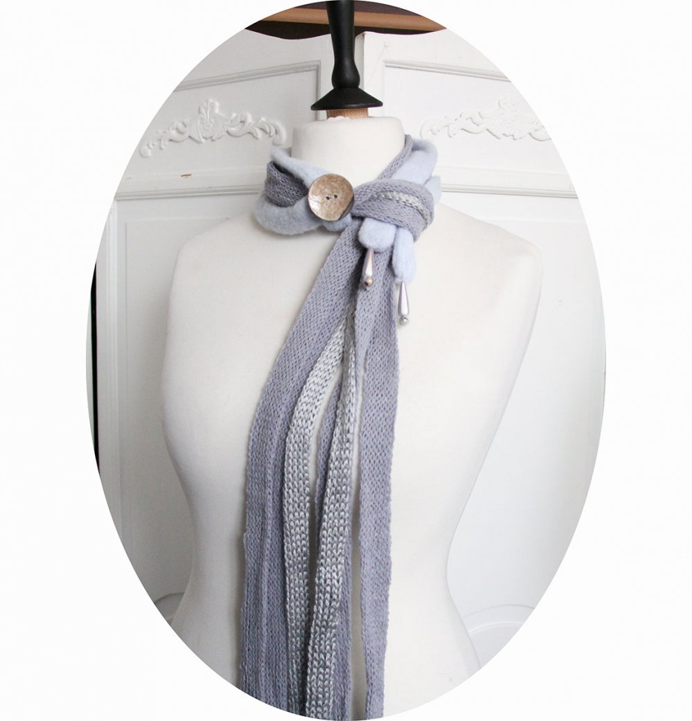 Pour ce modèle, j'ai associé un fil fantaisie bleu ciel, un fil de soie gris perle et de la laine bleu gris. L'extrémité des liens passe dans la boucle prévue cet effet pour venir se nicher au creux de votre cou.