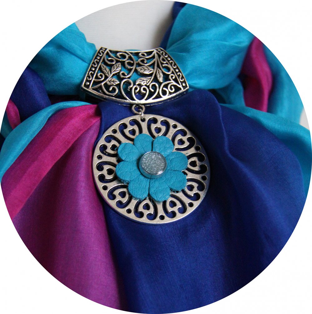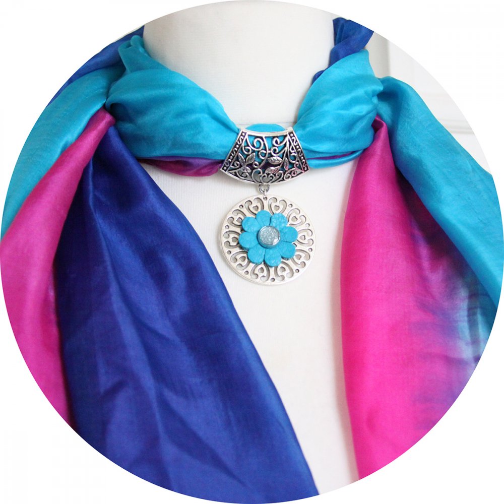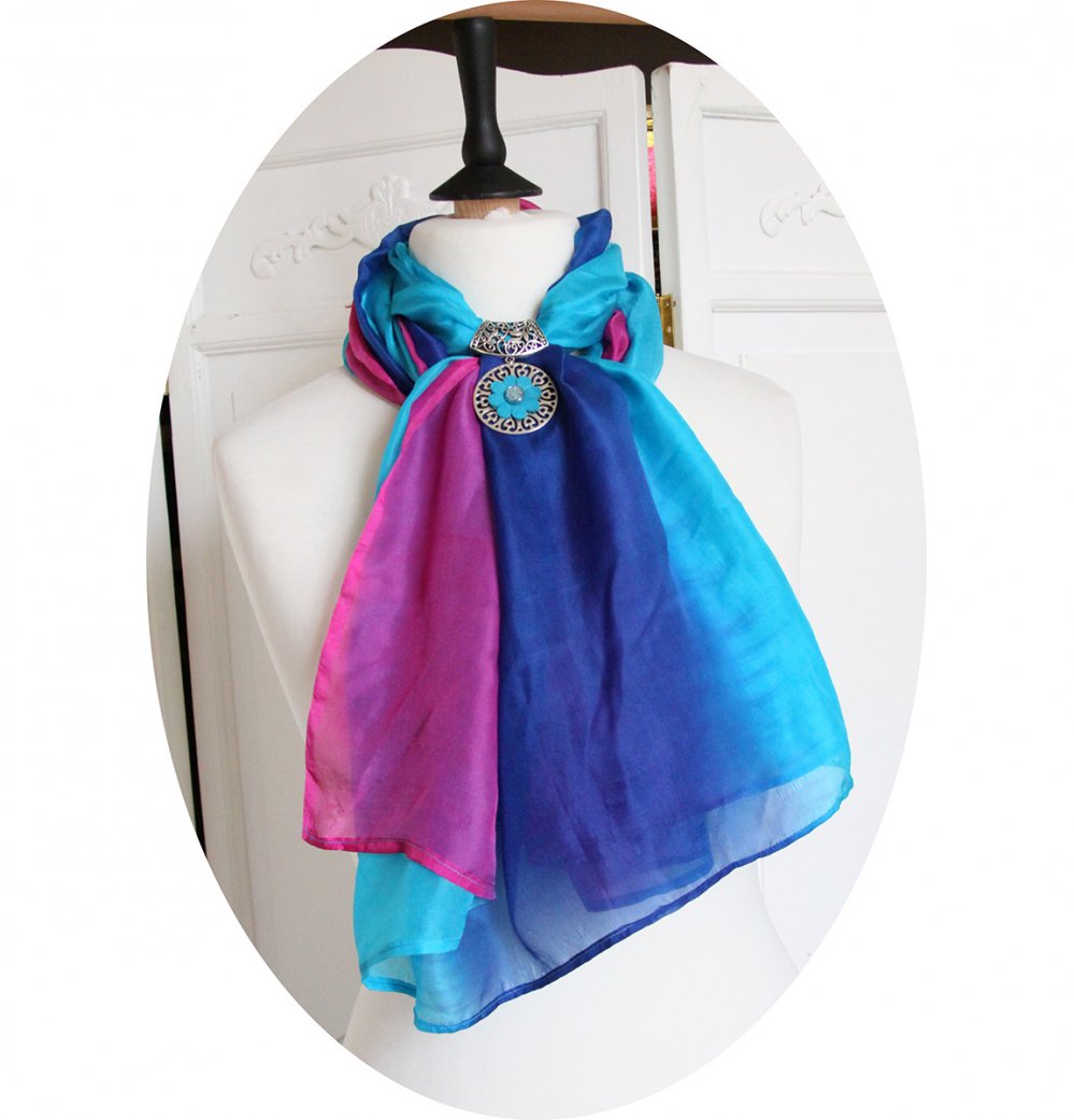 Étole en mousseline de soie bleu turquoise, bleu indigo et rose fuchsia.
