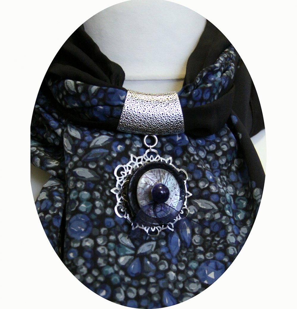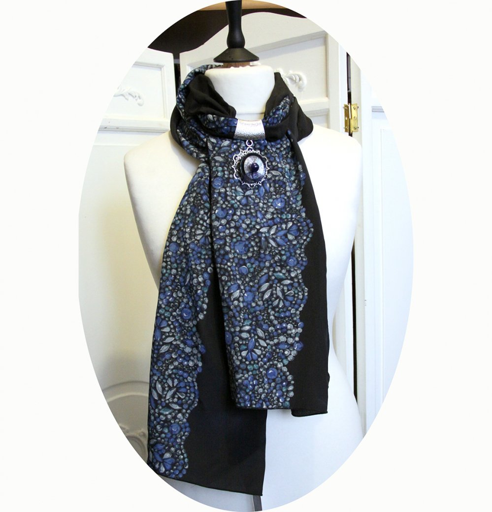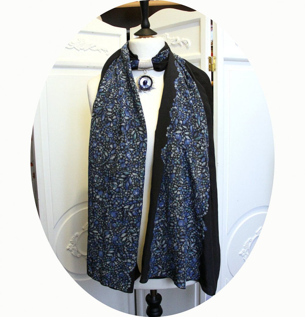 Écharpe noire et argent à bijou bouton en nacre. Pour ce foulard noire et bleue en soie j'ai choisi un crêpe de soie noire imprimé de motifs sequins bleus et gris, un tissu léger et vaporeux, doux et confortable. Pour compléter ce long foulard noir, j'ai ajouté un bijoux de foulard argenté avec un pendentif composé de boutons. Dimensions : 75cm x 200cm Lavable en machine (enlever la partie bijoux)Repassage sur l'envers.Étole en crêpe de soie noire et bleue