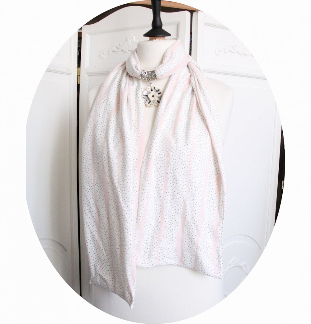 Pour ce foulard blanc en coton j'ai choisi un jersey de coton blanc, imprimé de rayures irrégulières rose clair et de petits points noir. Pour compléter ce long foulard blanc à pois, j'ai ajouté un bijoux de foulard argenté avec un pendentif fleur en céramique artisanale. Lavable en machine (enlever la partie bijoux)