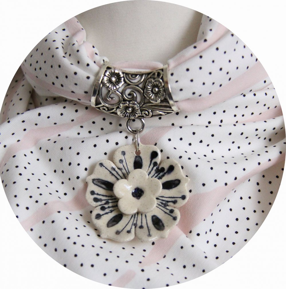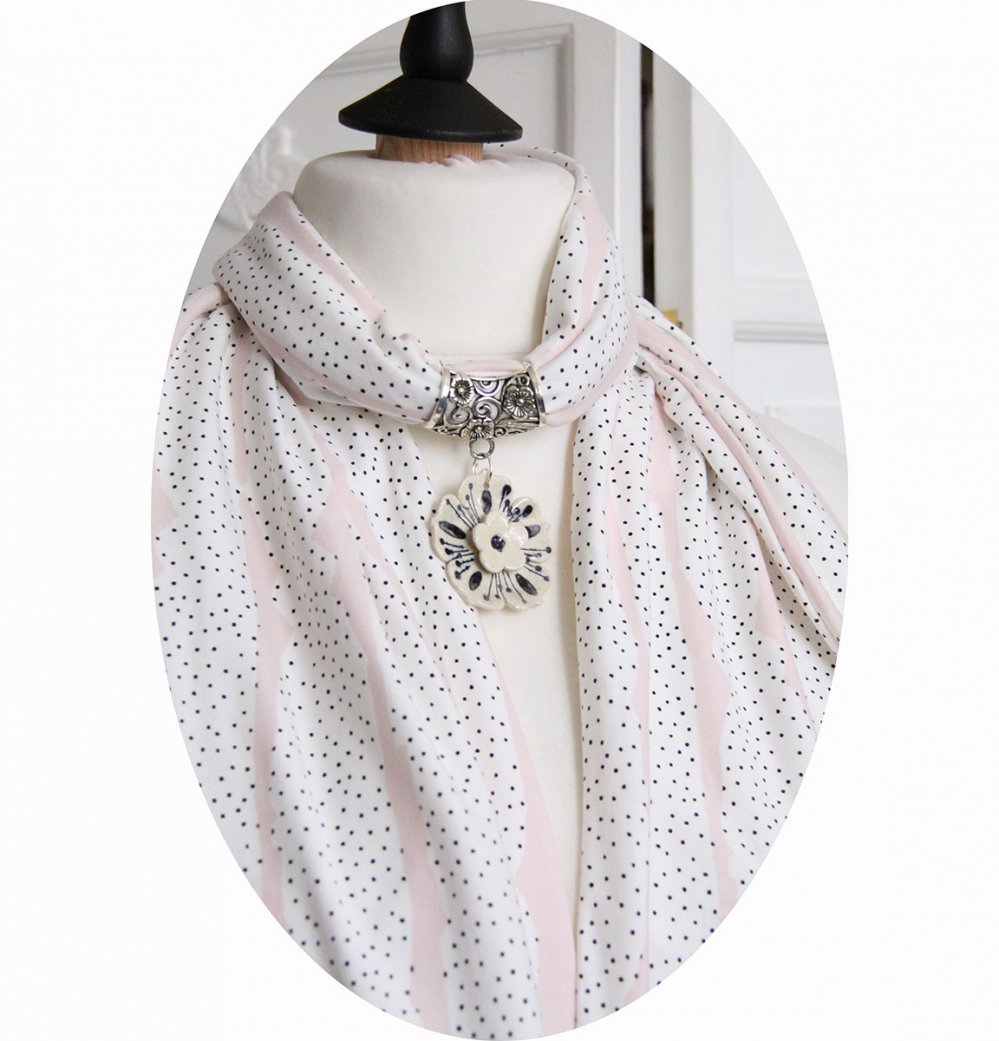 Foulard bijou en jersey de coton blanc et rose à pois noir et fleur en céramique.