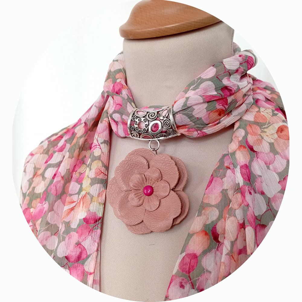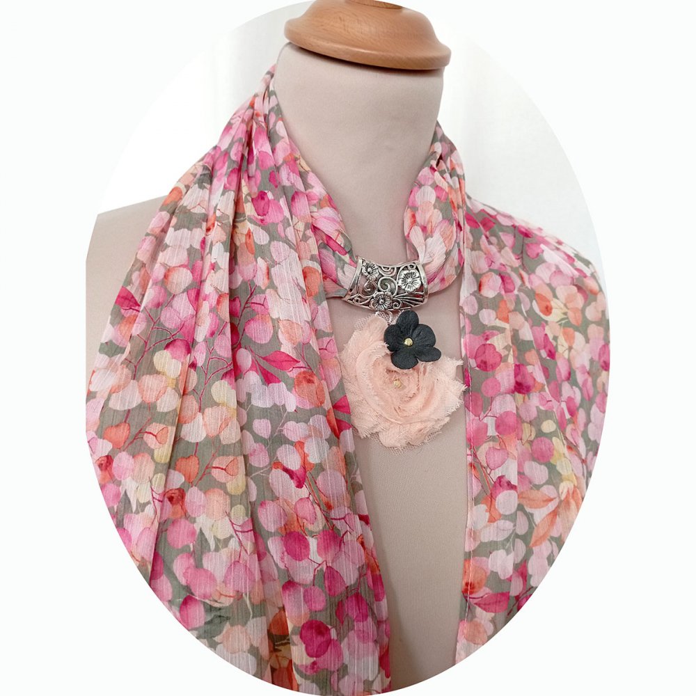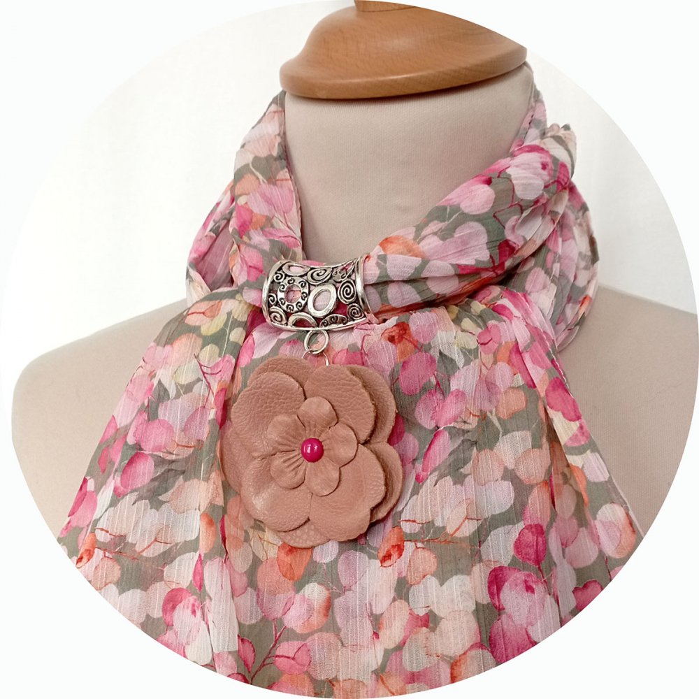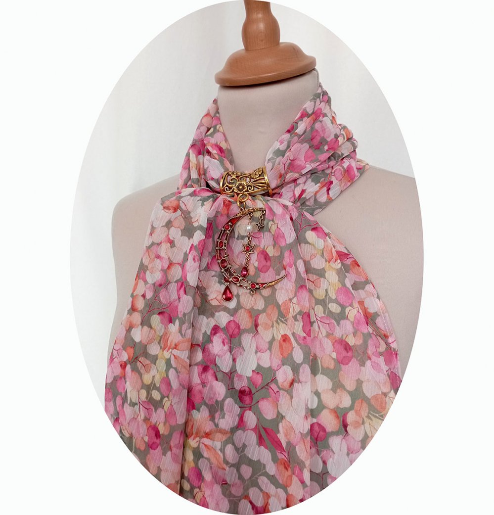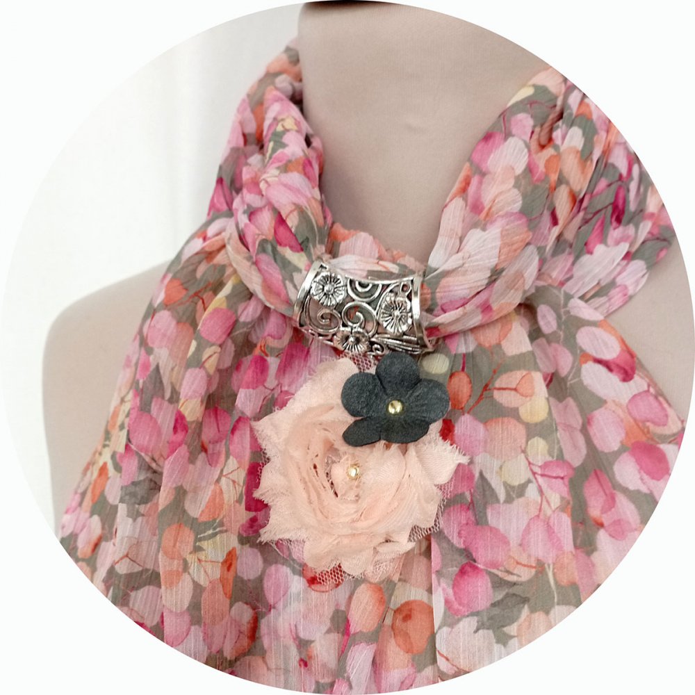 Foulard bijou gris et rose en mousseline et bijou de foulard.