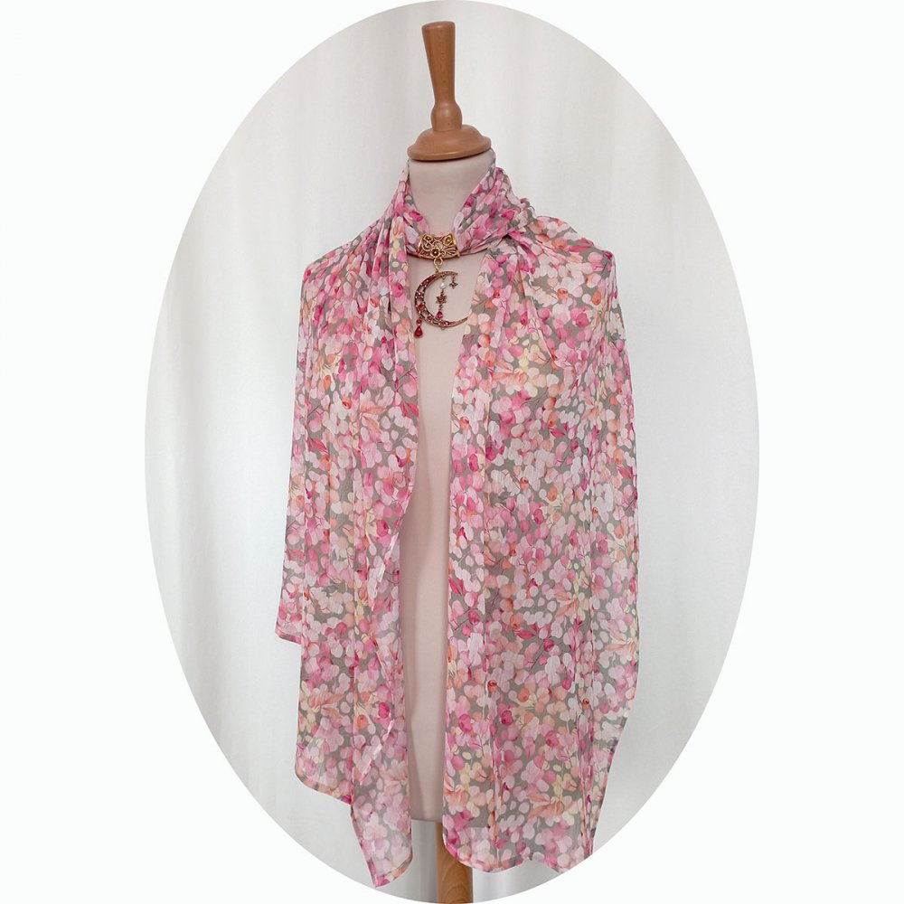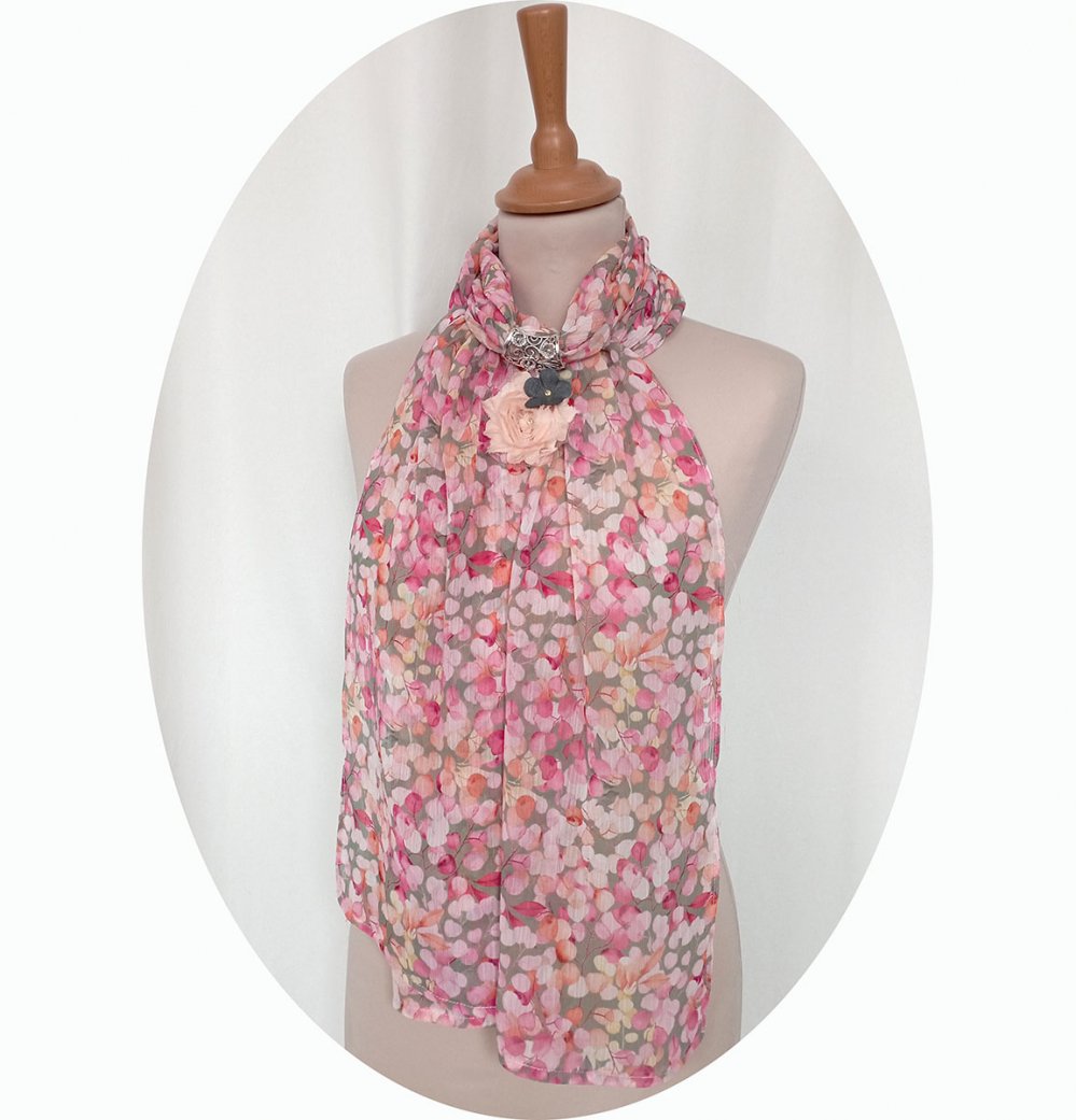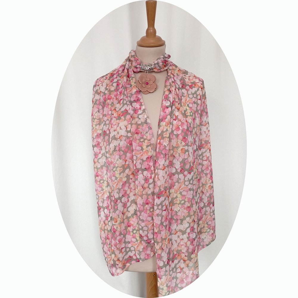 Écharpe grise à pétales roses bijou de foulard argenté Pour ce foulard gris et rose doux j'ai choisi une mousseline de polyester dans un bel imprimé coloré. Pour compléter ce long foulard gris et rose fluide, j'ai ajouté un bijoux de foulard argenté ou doré. J'ai réalisé trois foulards, chacun avec un bijou unique : bijou fleur de simili cuir, bijou fleur en tissu ou bijou lune dorée Dernier modèle disponible : numéro 1 Lavable en machine (enlever la partie bijoux)Repassage sur l'envers.Foulard bijou gris et rose en mousseline et bijou de foulard.