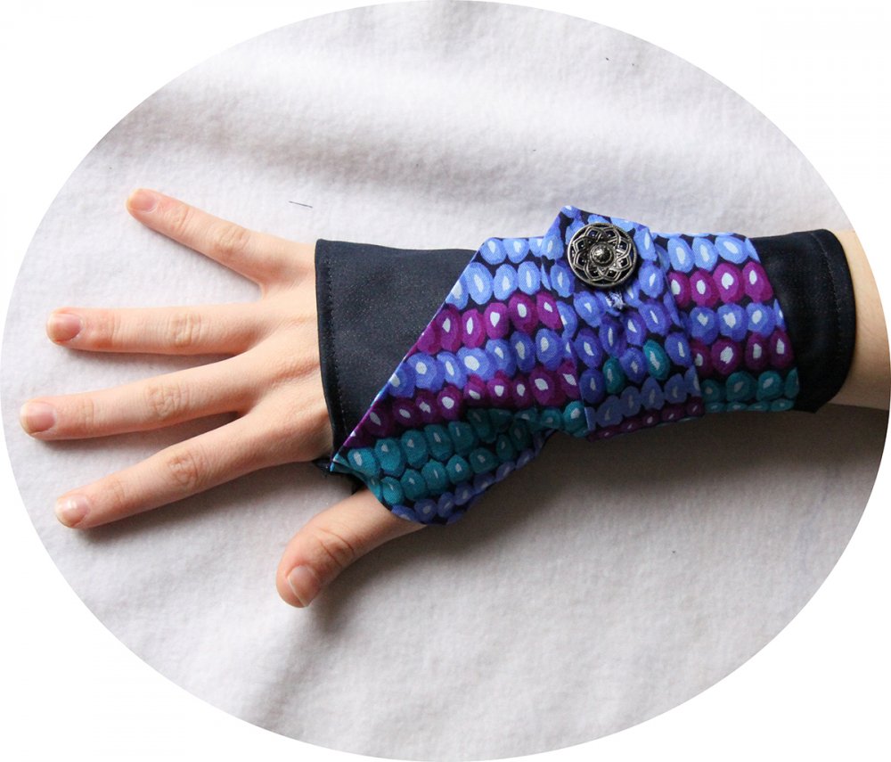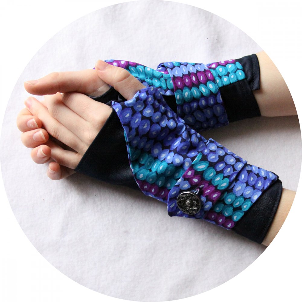 Mitaines ajustables en tissu bleu jean et imprimé perles bleu mauve et vert.