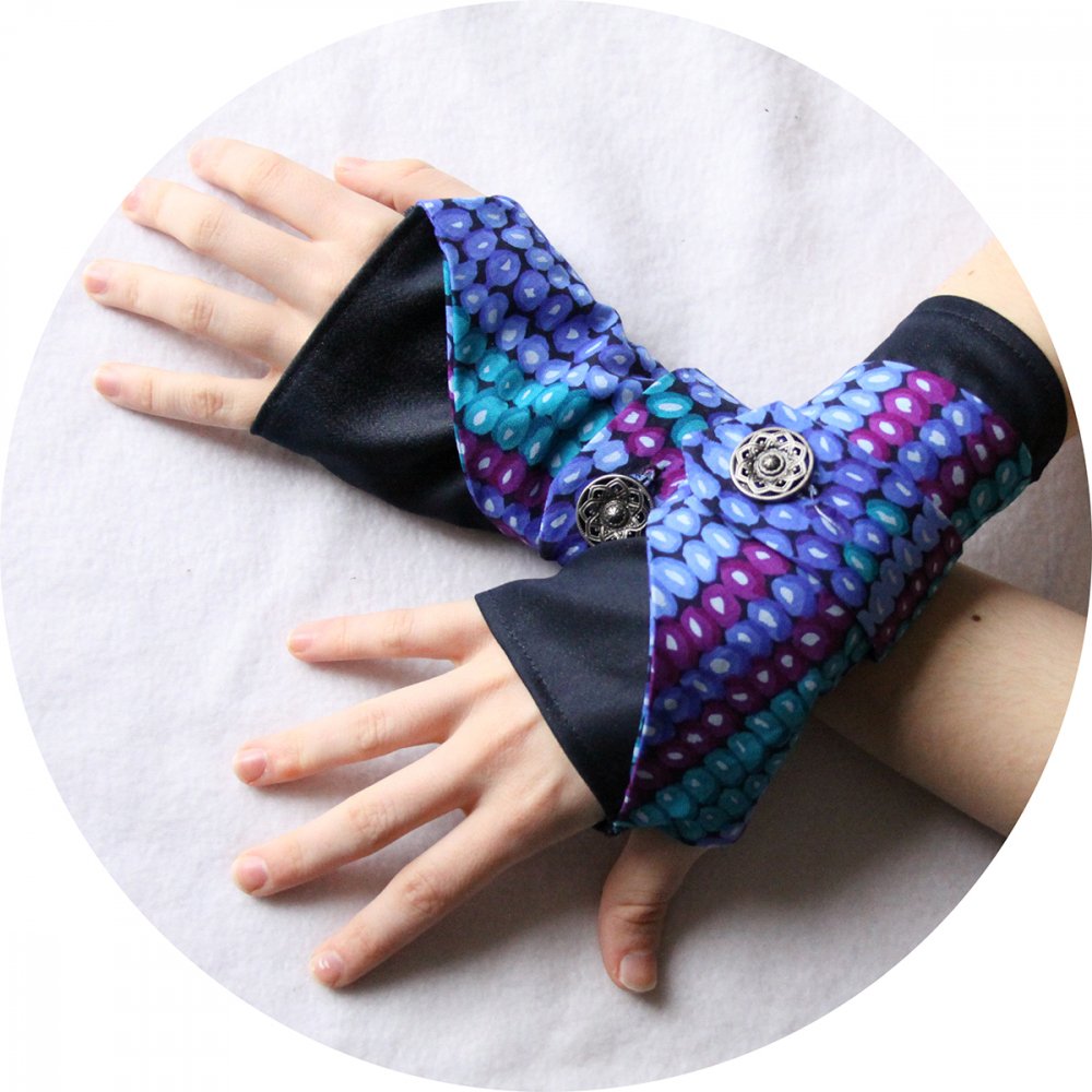Manchettes mitaines bleu violet vert en coton doux bleu jean uni et imprimé perles mauves