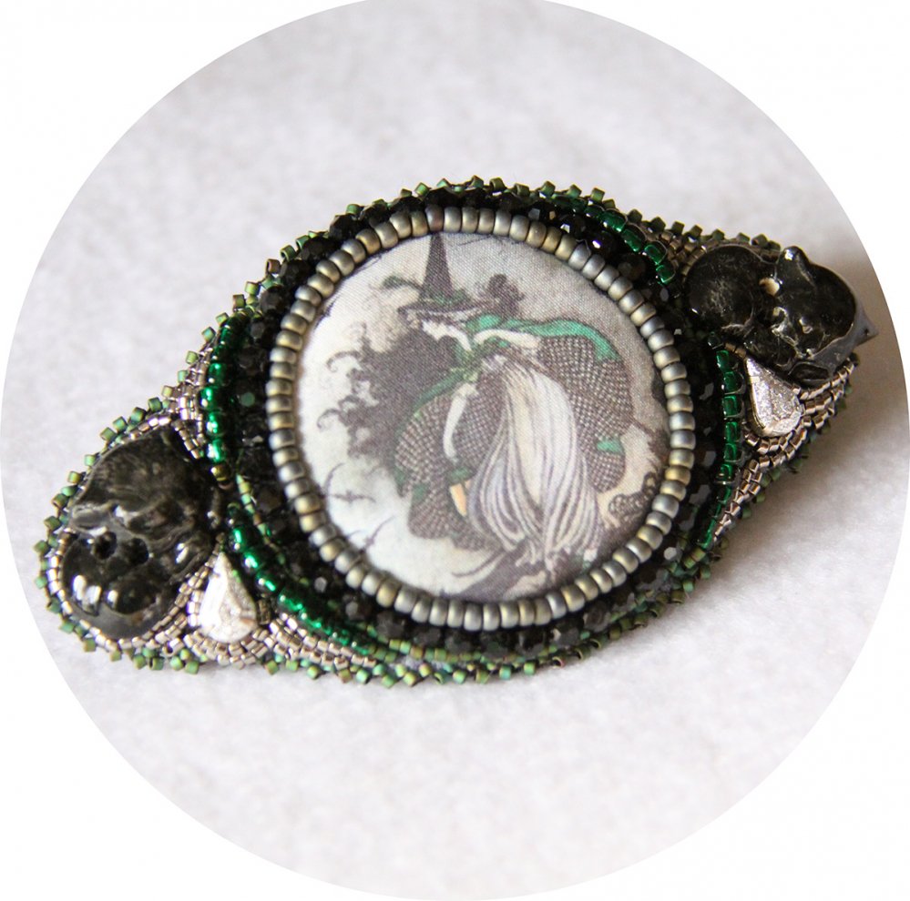 Pour cette barrette, je suis partie d'un motif de petite sorcière imprimé sur tissu, que j'ai transformé en cabochon. Ce cabochon est fixé sur une base de feutrine, et entourée de perles noires et vertes.