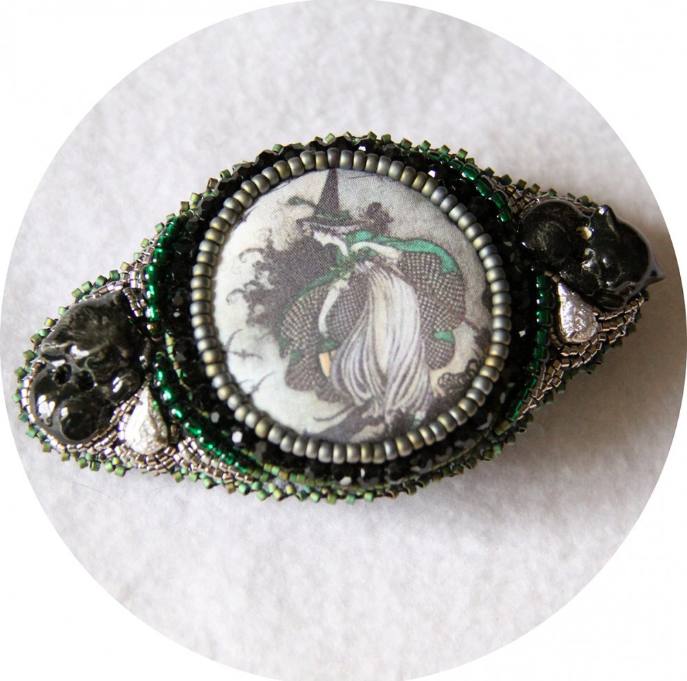 Deux boutons chats noirs entourent la petite sorcière avec son chapeau noir pointu, eux aussi entourés de broderie de perles miyuki argent.