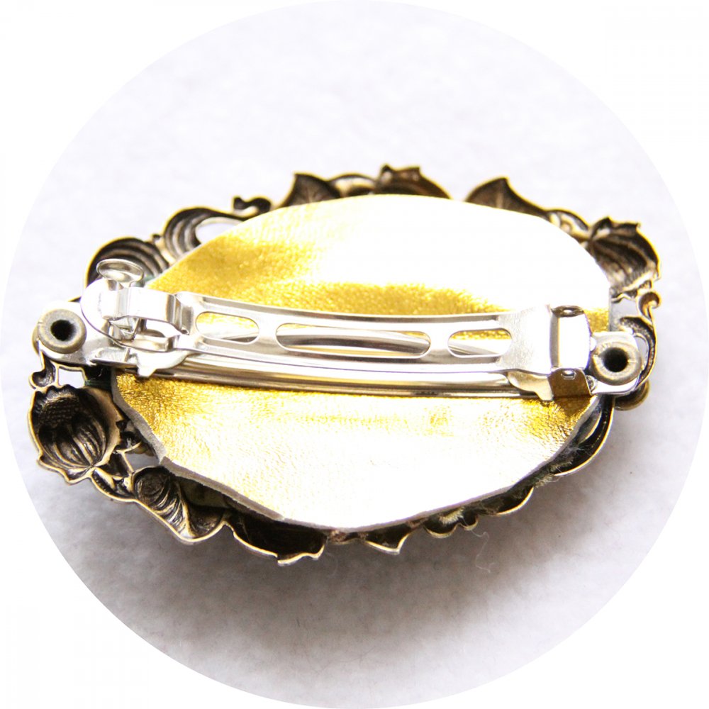 Barrette textile et laiton, avec broderie de perle de cristal.