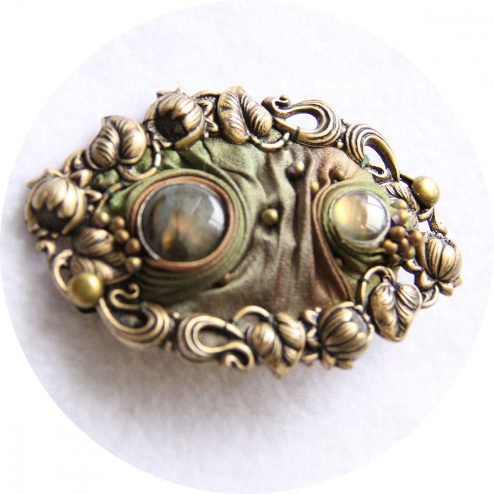 Pour le médaillon, j'ai choisi un ruban de soie shibori plissé dans les tons vert kaki et ocre, positionné autour de cabochons en labradorite,que j'ai brodé de perles irisées en verre de Bohème.