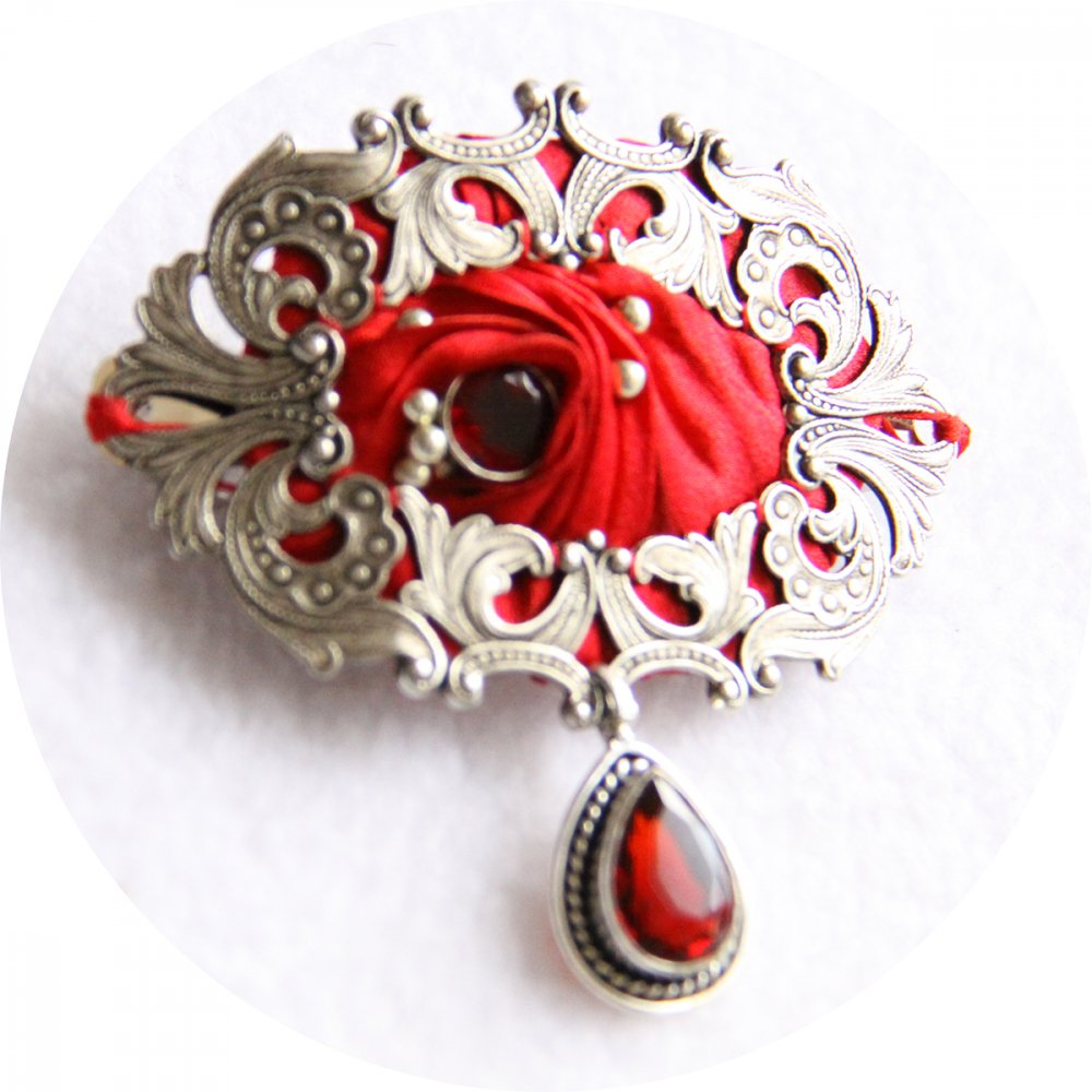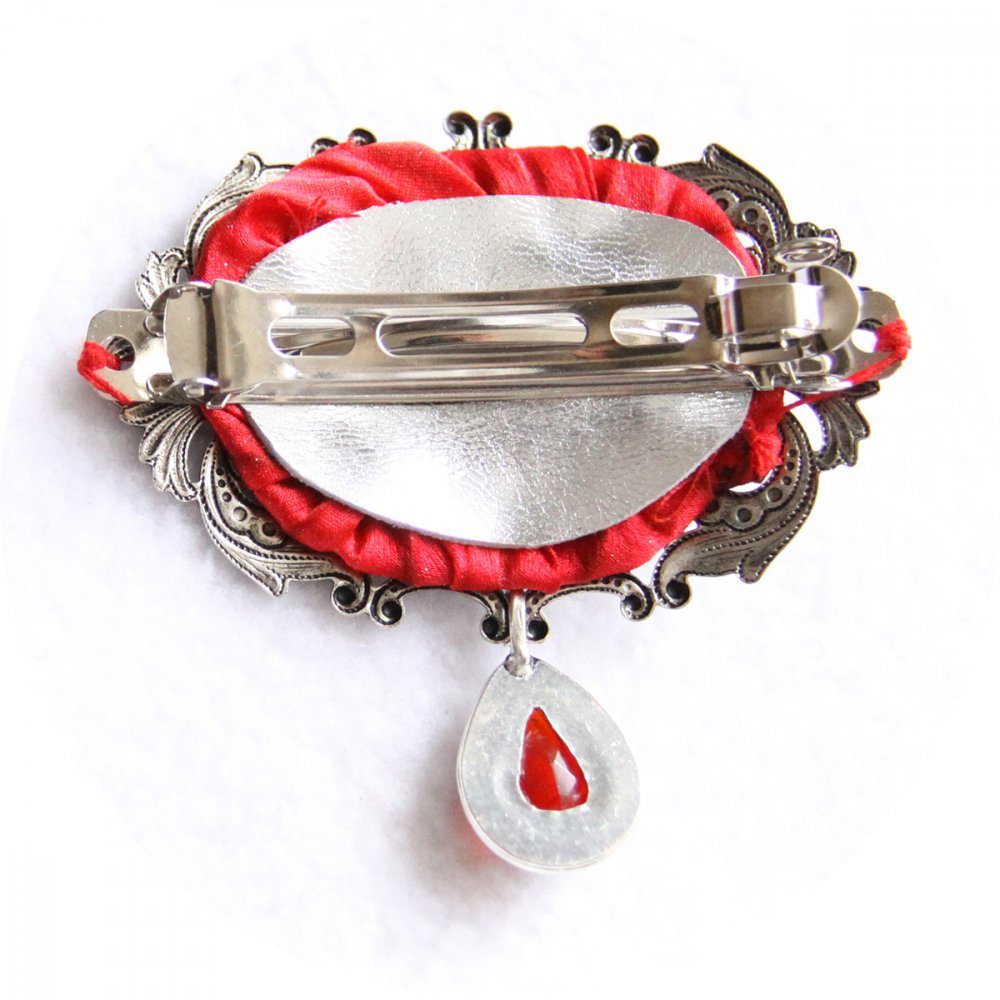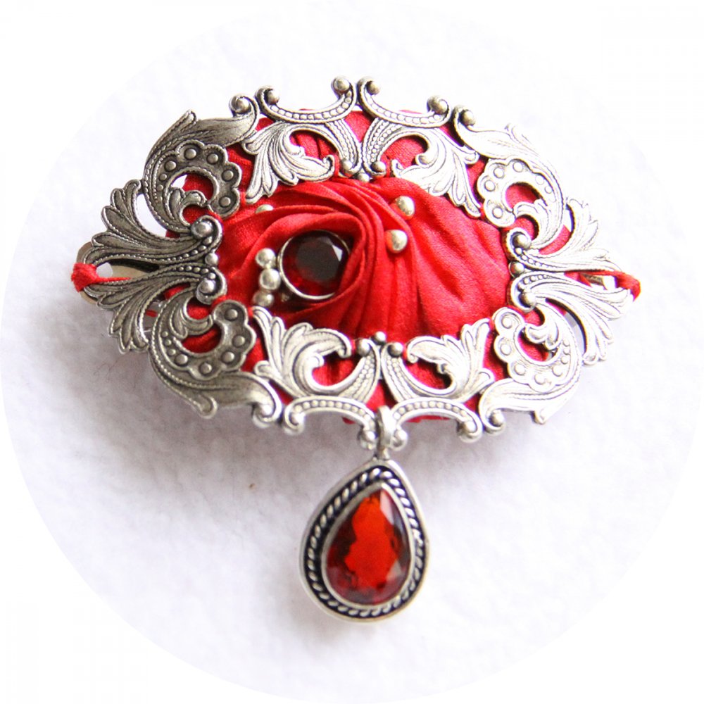 Barrette textile et laiton, avec broderie de perle de cristal et cabochon rouge rubis