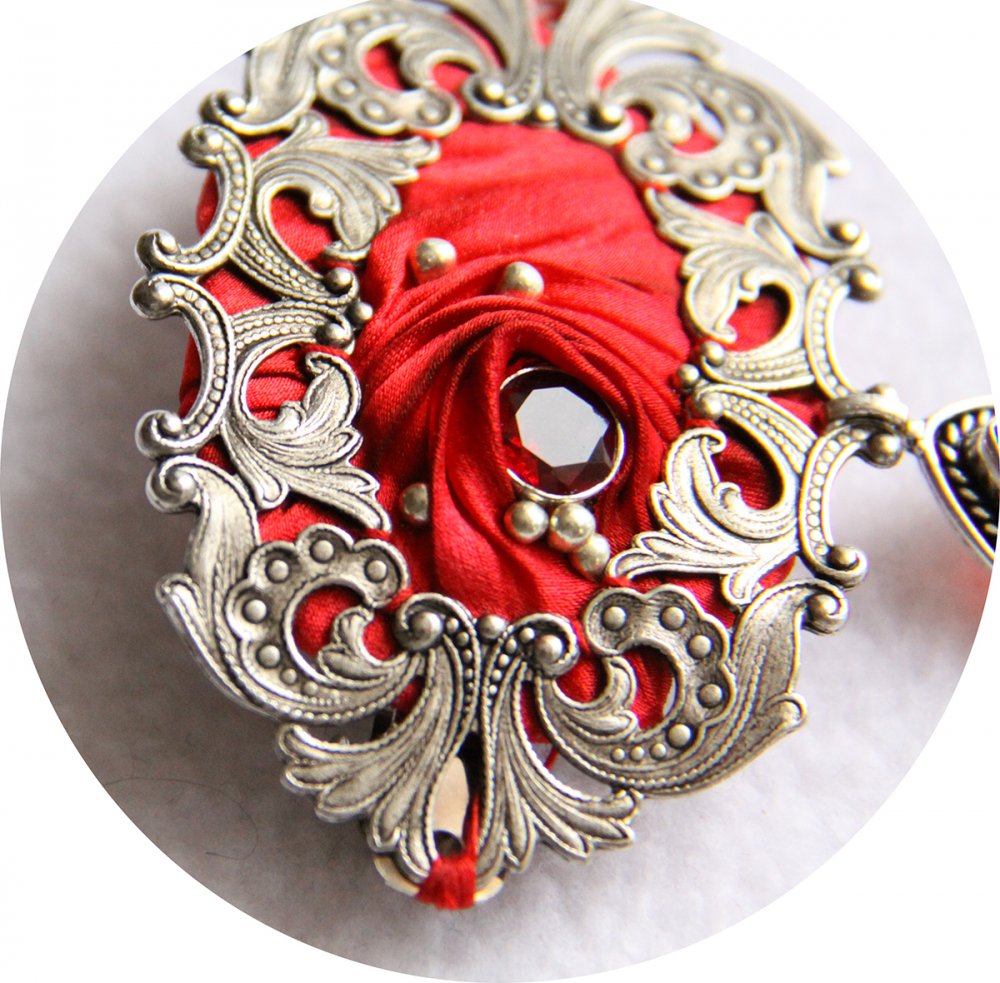 Pour le médaillon, j'ai choisi un ruban de soie shibori plissé dans les tons rouge vif, positionné autour d'un cabochon rond rouge rubis,que j'ai brodé de perles argentées en verre de Bohème.