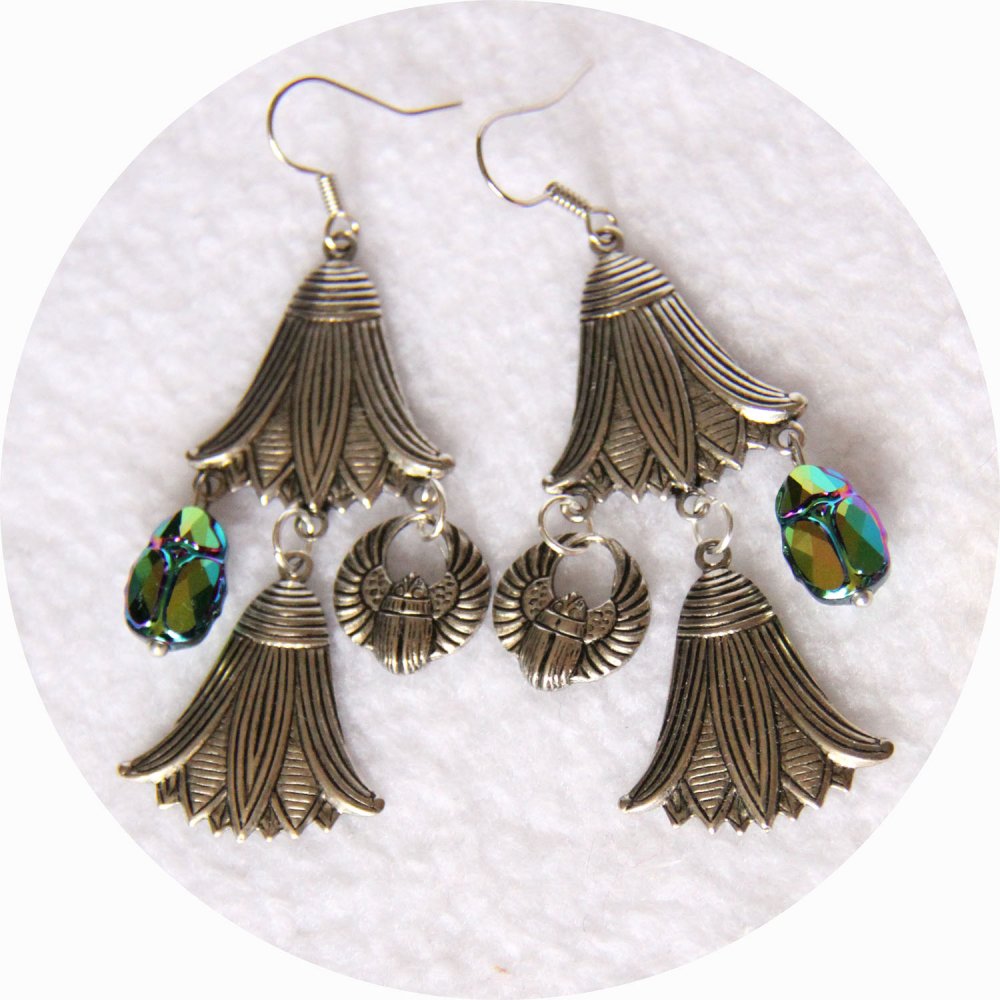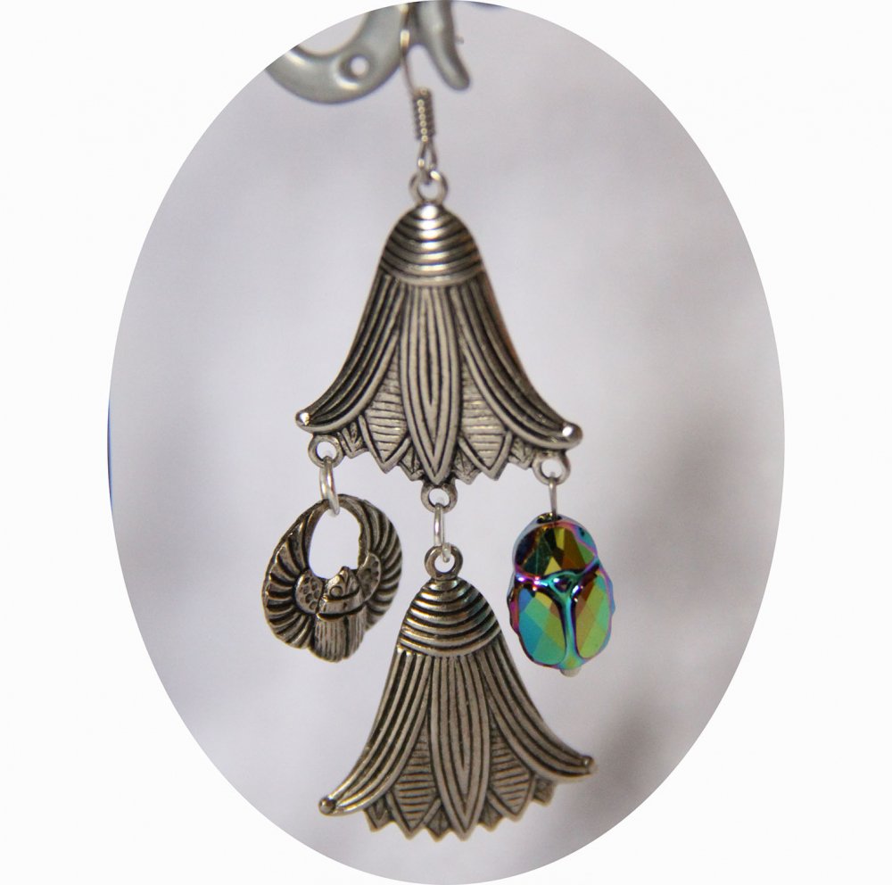 Pour ces boucles, j'ai choisi deux belles estampes fleur de lotus et des petites breloques assorties,soulignées par des perles scarabée de Swarocki dans les ton violet/vert et des mini breloques scarabée.