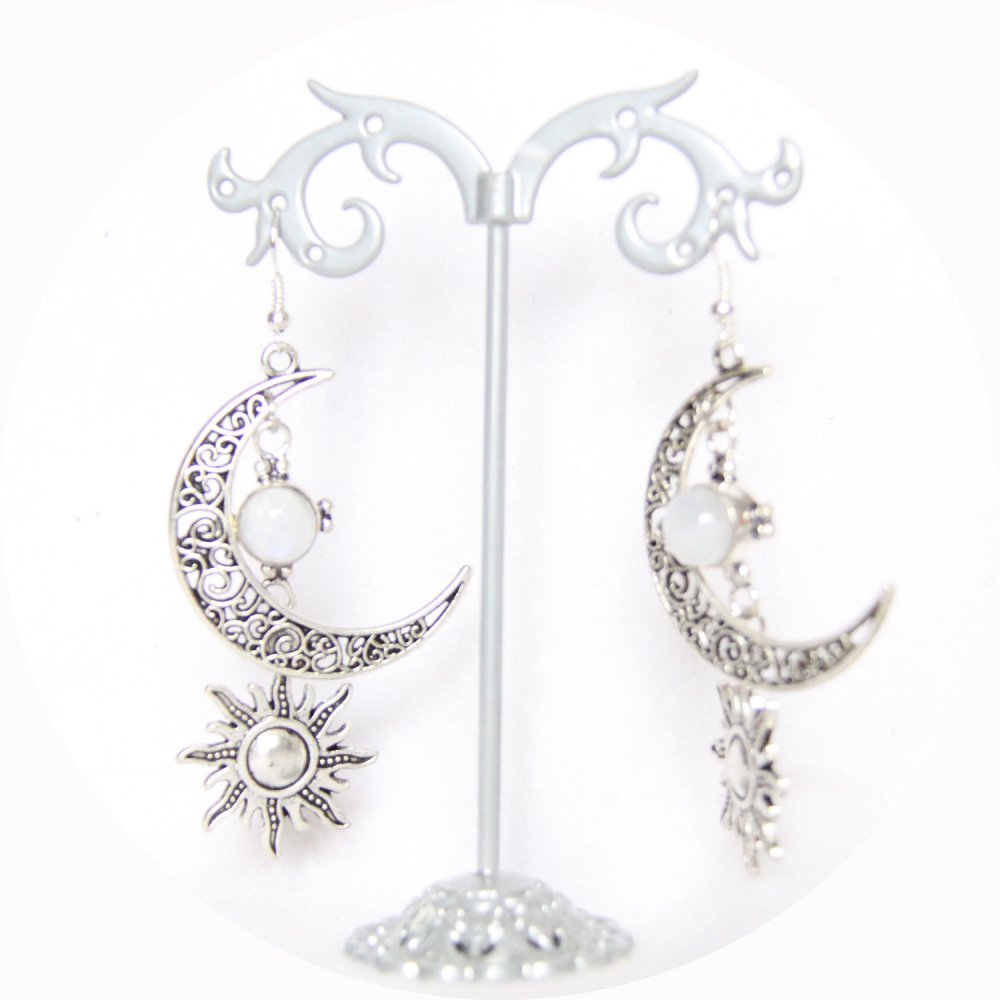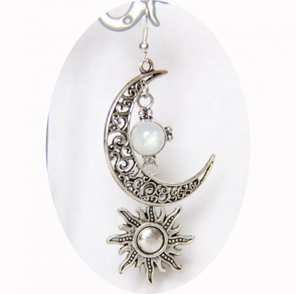 Boucles d'oreilles en pierre de lune thème soleil et lune.