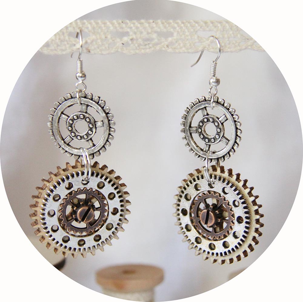 Boucles d'oreilles d'inspiration Steampunk victorien en rouages métal et bois.