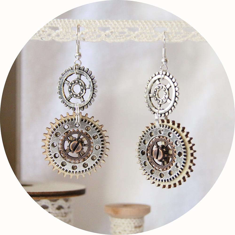 Boucles d'oreilles Steampunk bois et métal argent et cuivre