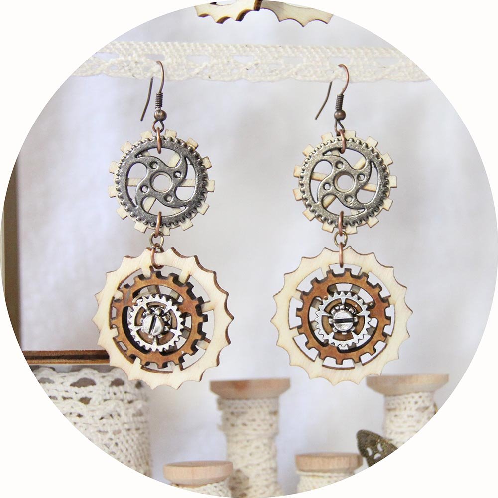 Boucles d'oreilles d'inspiration Steampunk victorien en rouages métal et bois.