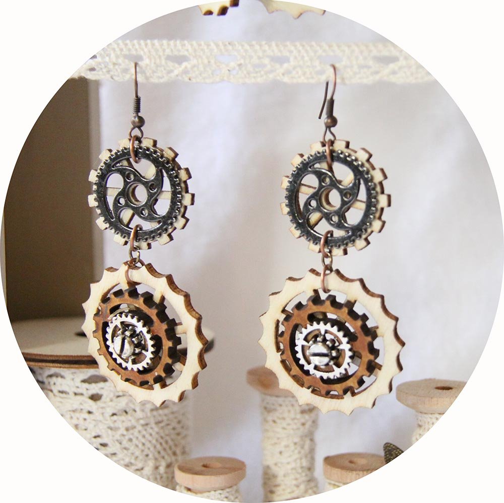 Pour ces boucles d'oreilles pendantes, j'ai choisi d'associer des rouages en bois clair  t foncé à des rouages en métal coloris gunmetal et argent.