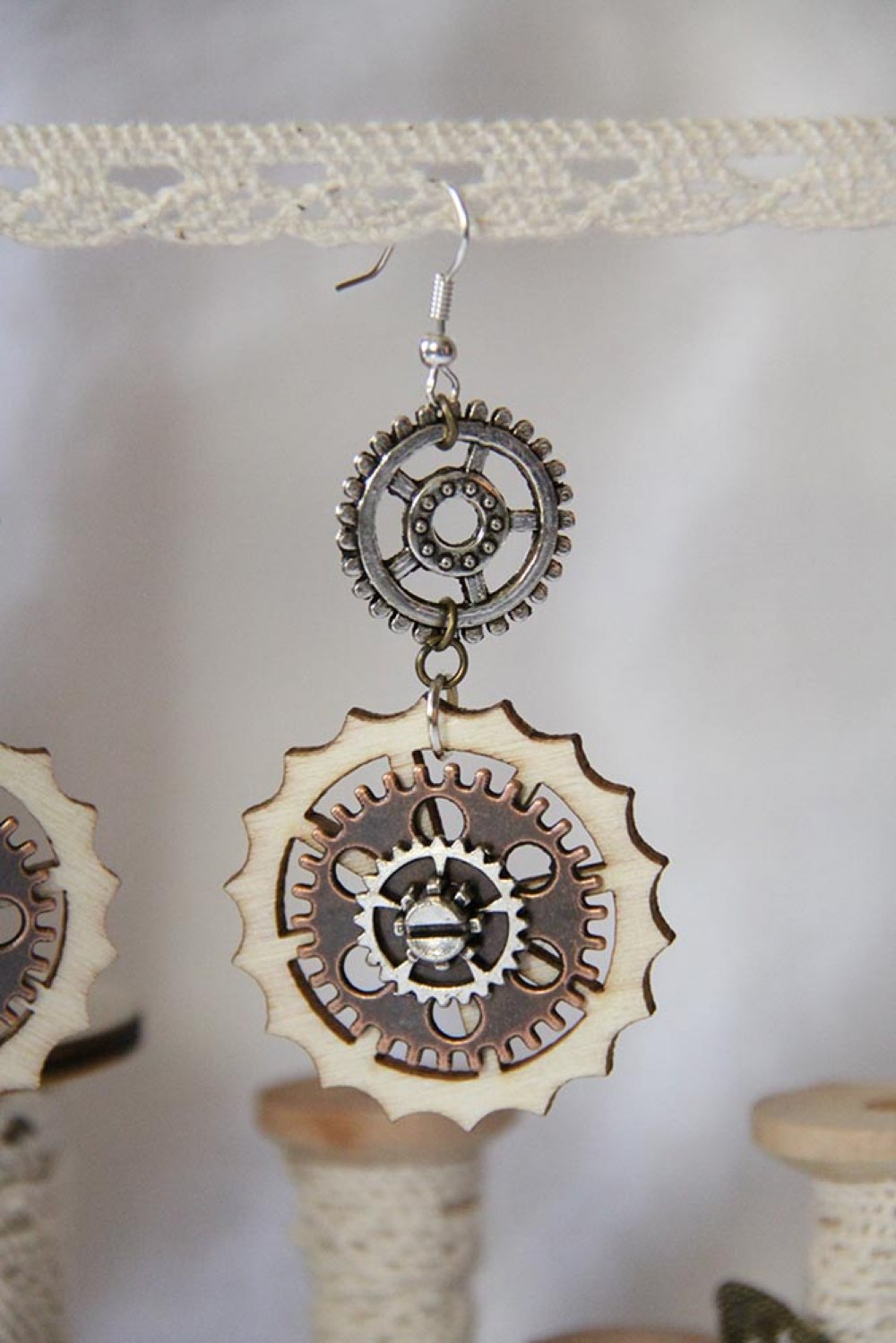 Boucles d'oreilles d'inspiration Steampunk victorien en rouages métal et bois.
