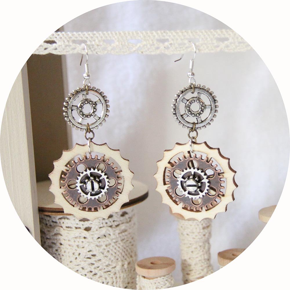 Pour ces boucles d'oreilles pendantes, j'ai choisi d'associer des rouages en bois clair  à des rouages en métal coloris cuivre et argent.
