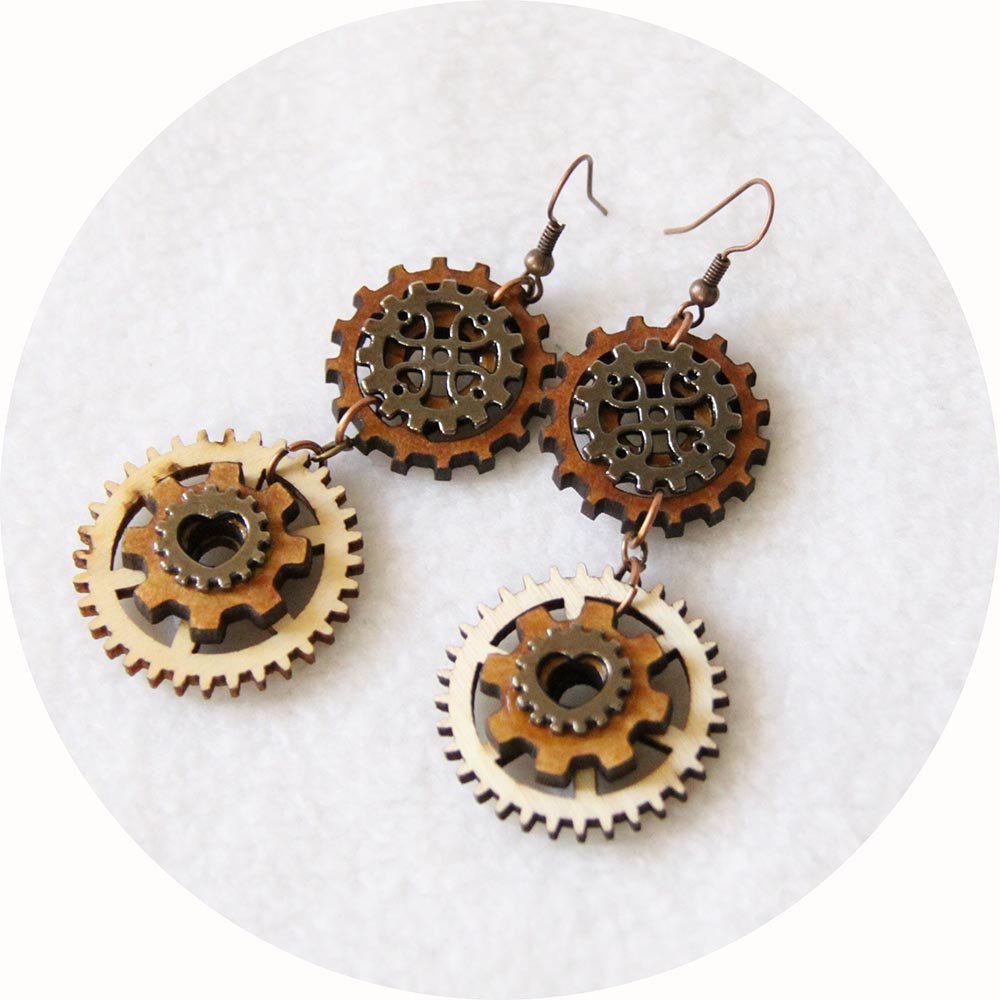 Boucles d'oreilles d'inspiration Steampunk victorien en rouages métal et bois.