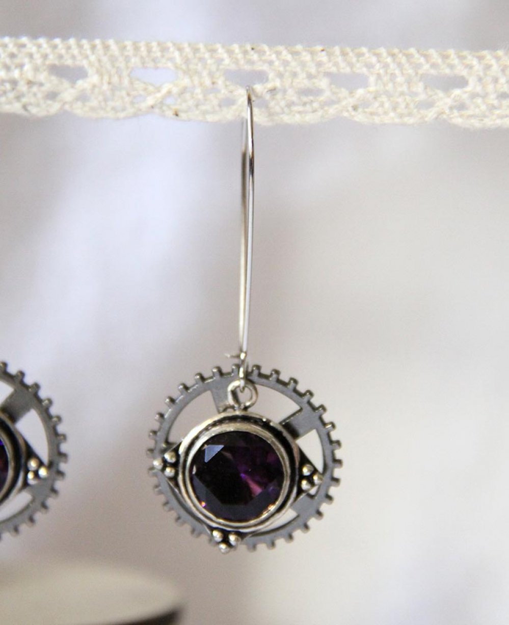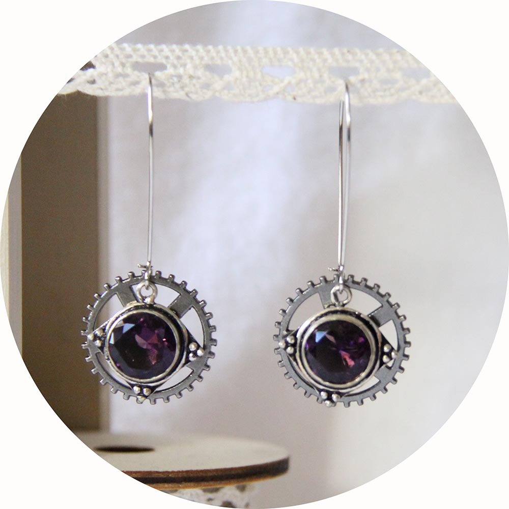 Pour ces boucles d'oreilles pendantes, j'ai choisi un rouage en métal coloris gunmetal (gris foncé) pour le coté steampunk ainsi qu'un cristal mauve améthyste serti  de métal plaqué argent pour le coté victorien.