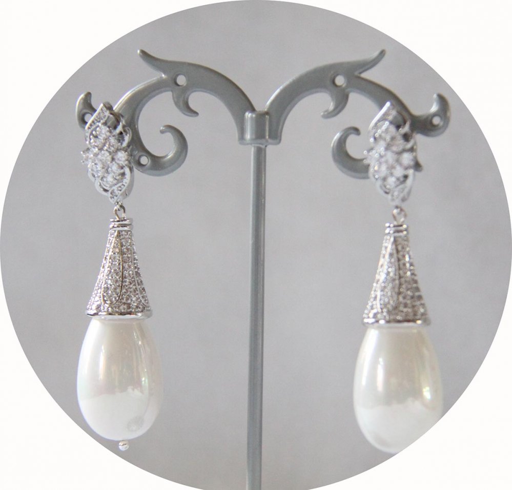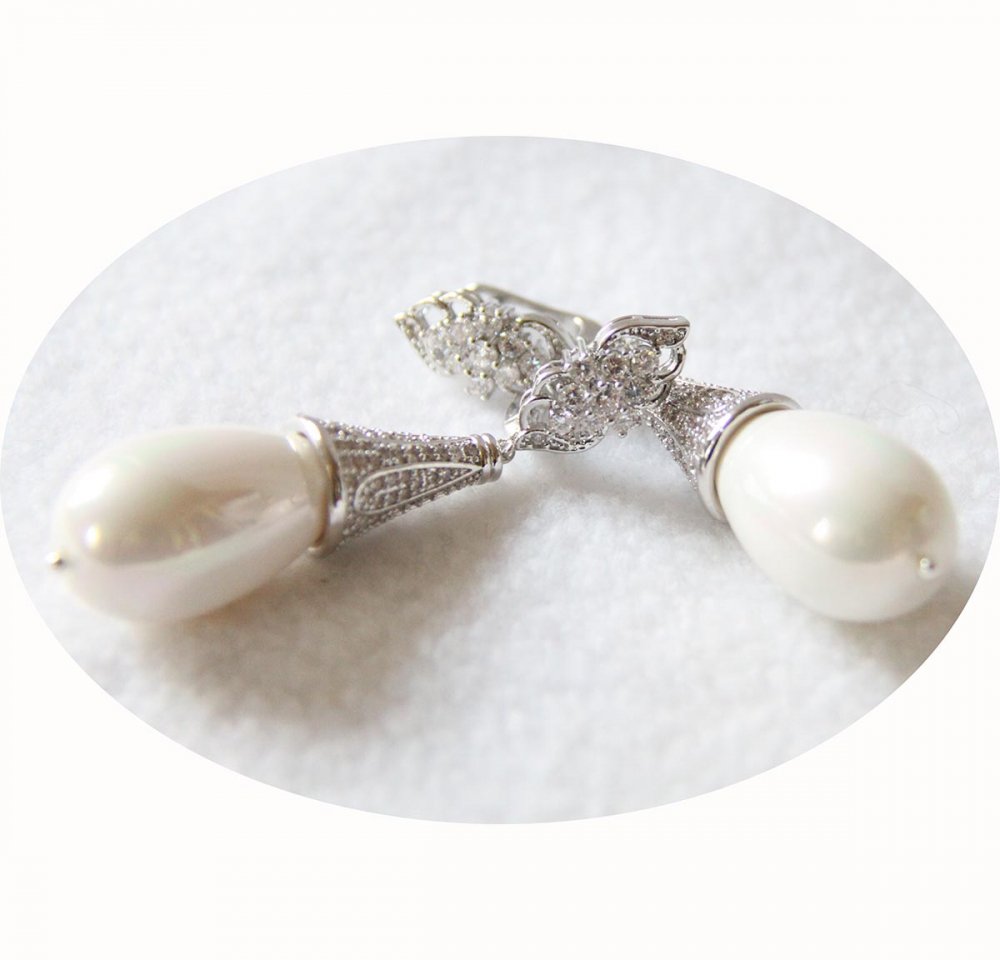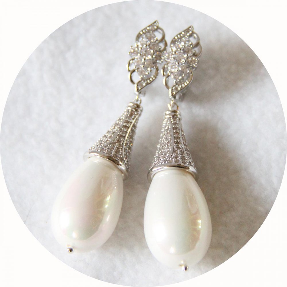 Boucles d'oreilles baroques grande goutte nacrée et attaches dormeuses argentées strassées