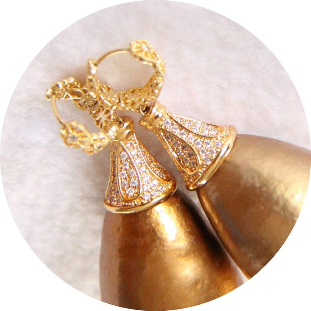 Pour les compléter j'ai choisi deux caps coniques en métal doré et strassé ainsi que des attaches dormeuses filigranées en plaqué or également strassées.
