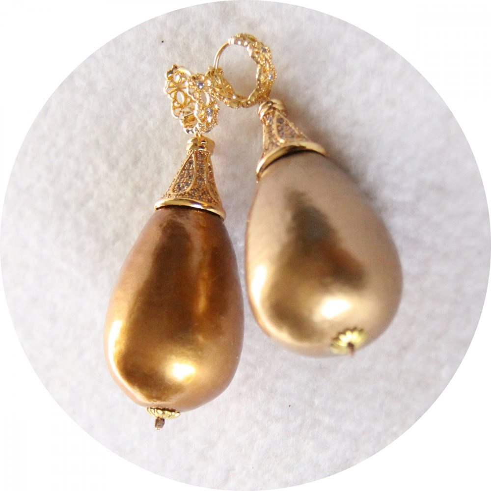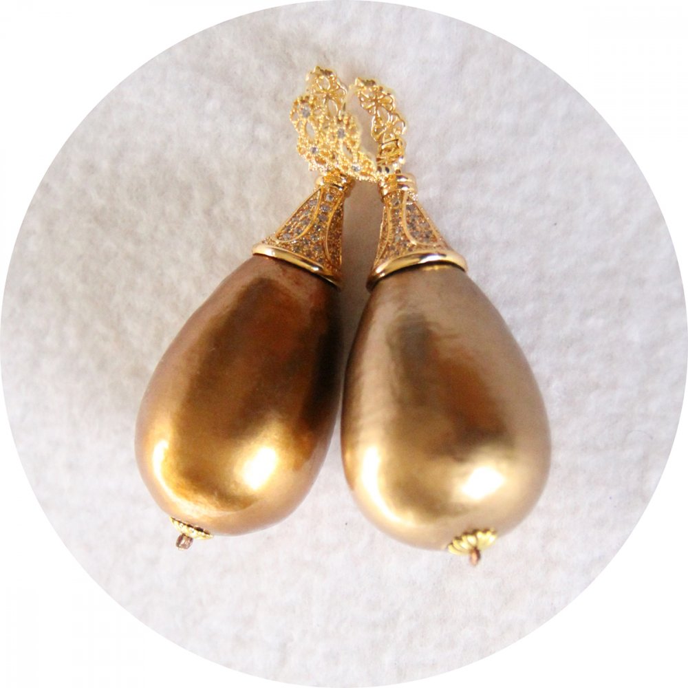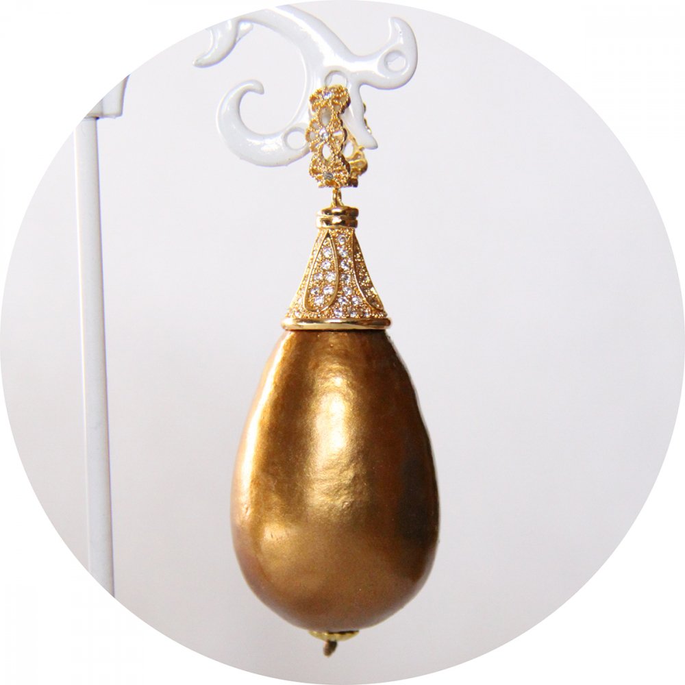 Boucles d'oreilles baroques grande goutte perle bronze et attaches dormeuses dorées strassées