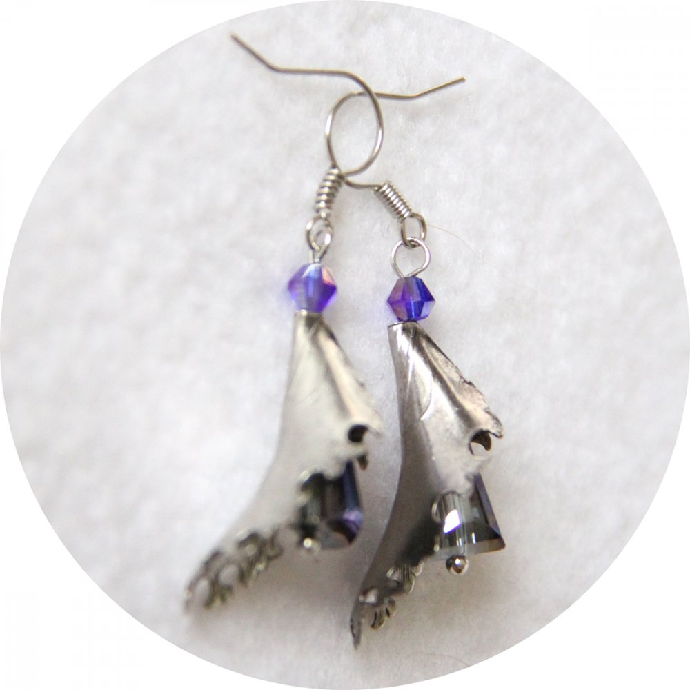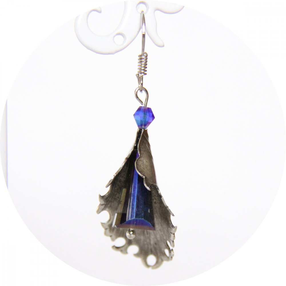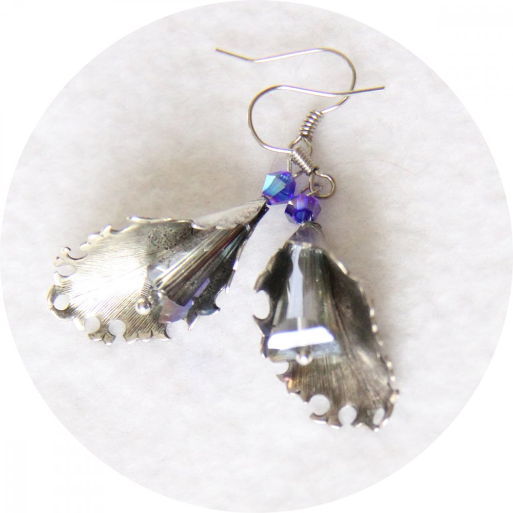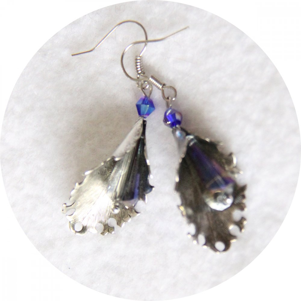 Pour ces boucles d'oreilles pendantes en forme de corolle, j'ai choisi deux estampes dentellées en laiton plaqué coloris argent antique, associées à des perles de cristal bleu.