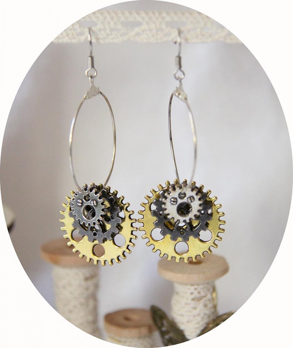 Boucles d'oreilles créoles Steampunk rouages doré, gunmetal et argent