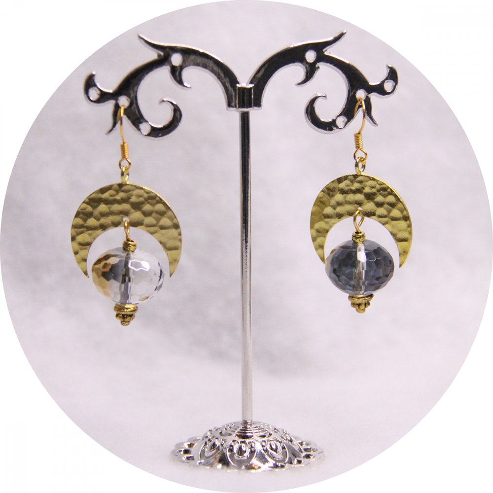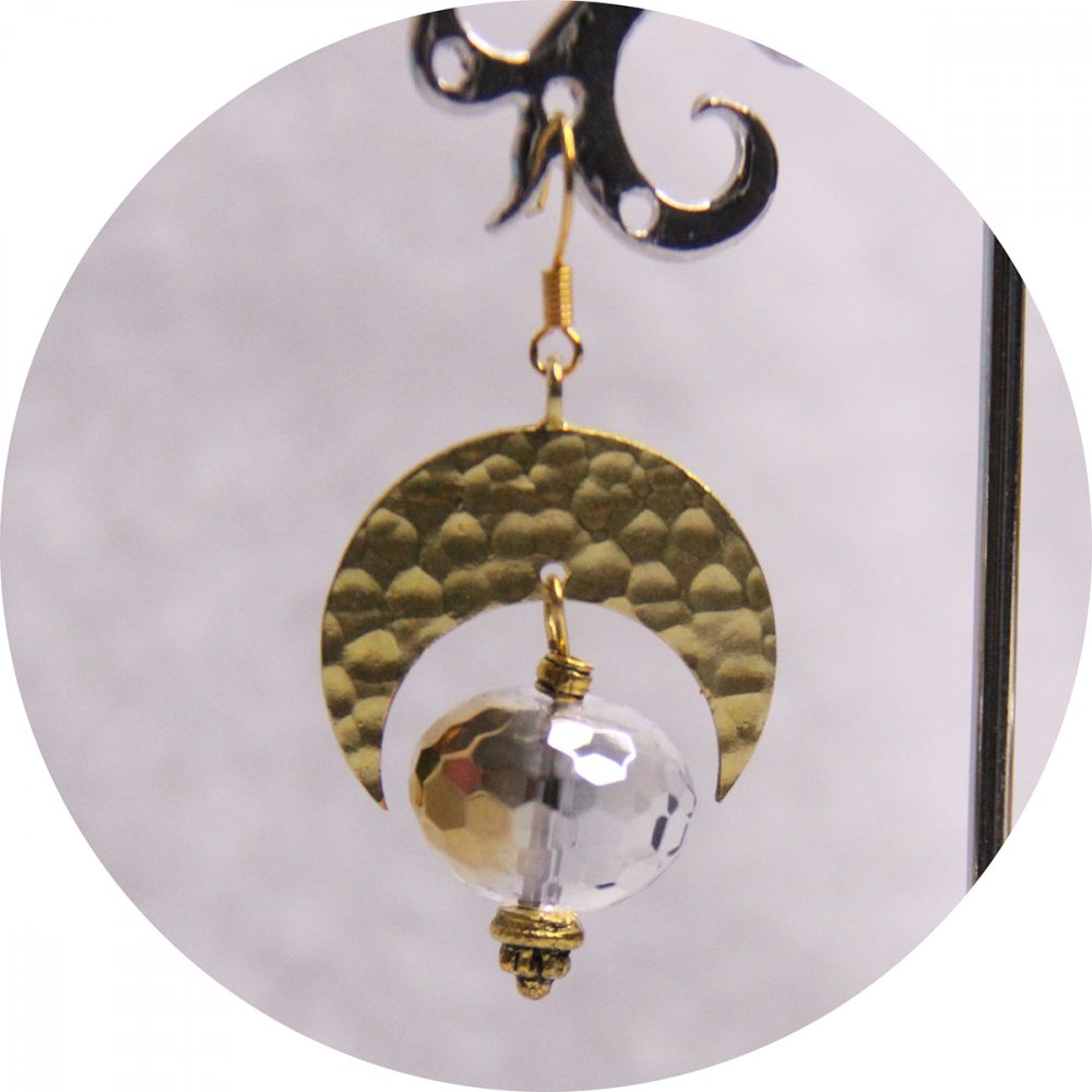 Pour ces boucles d'oreilles j'ai choisi deux croissants de lune en laiton plaqué doré, à effet martelé, et deux perles en cristal faceté, irisé bronze.