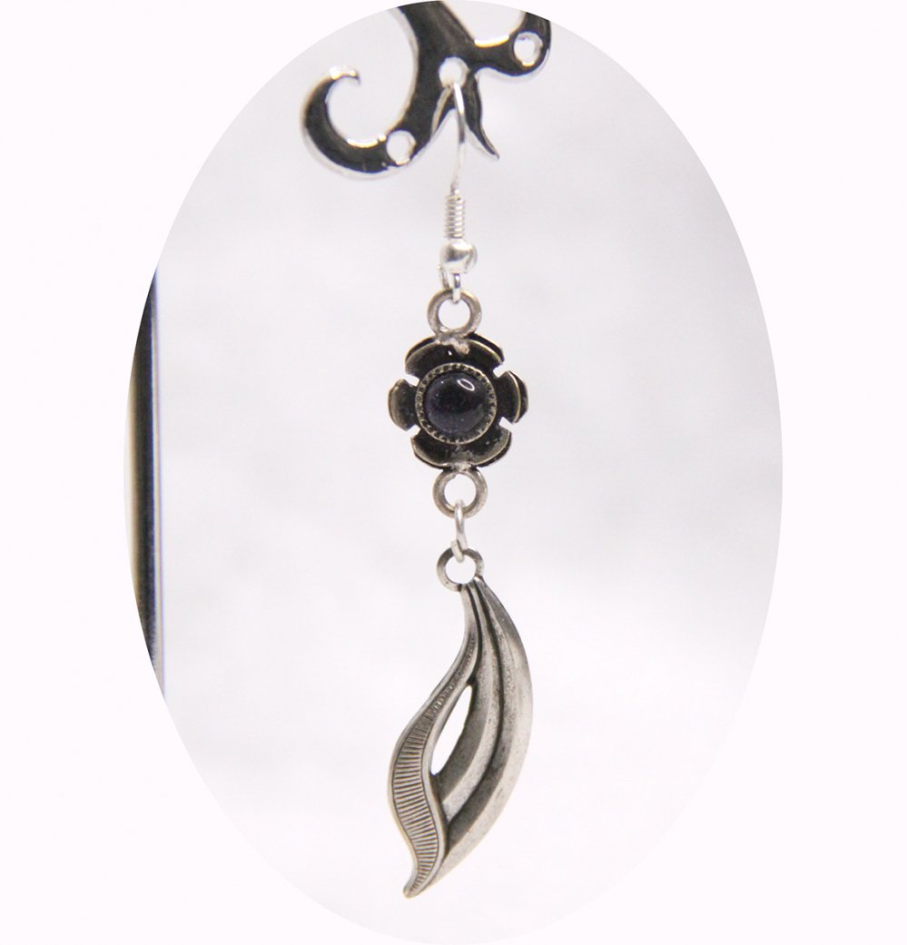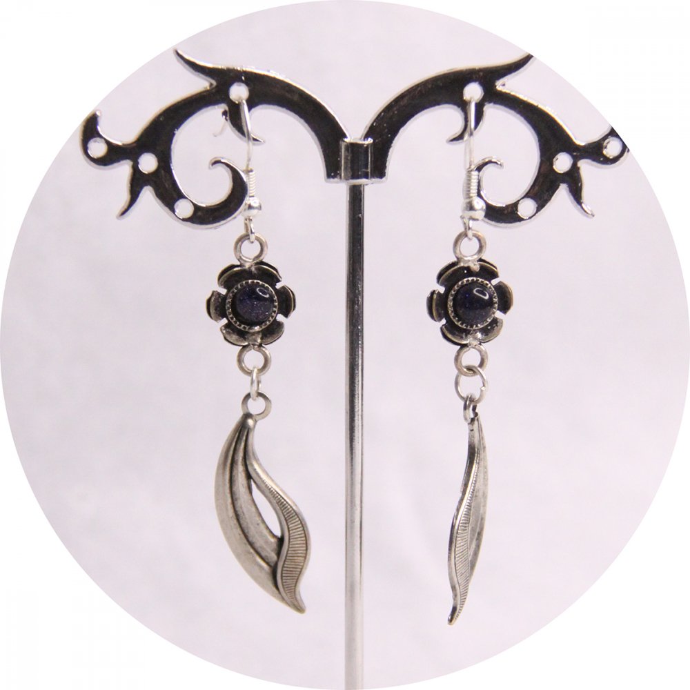 Pour ces boucles d'oreilles d'un style art nouveau j'ai associé deux fleurs aregntées à coeur en pierre de soleil bleue à des estampes haute qualité de style art nouveau en laiton plaqué en coloris argent antique.