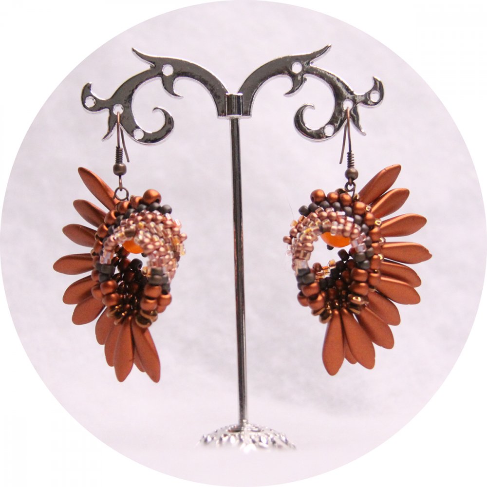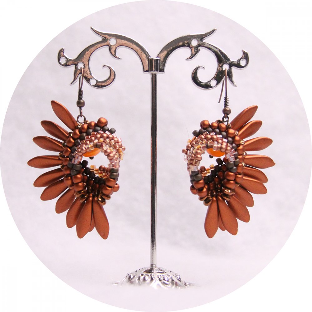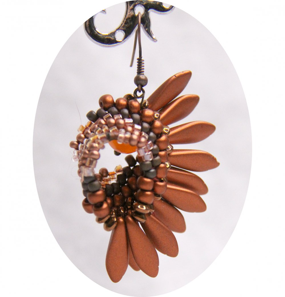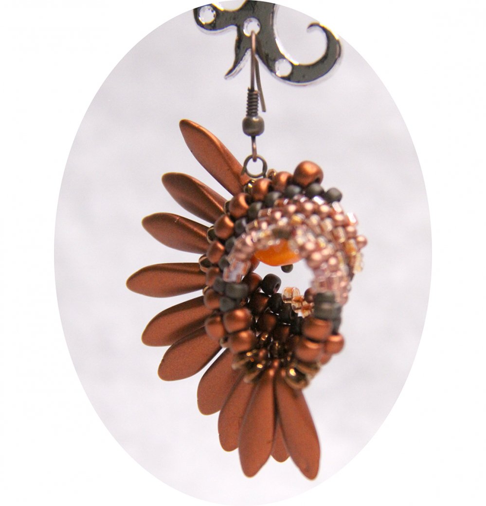 Ces boucles d'oreilles ovales en coloris orange cuivré sont composées d'une spirale de perles Miyuki de plusieurs tailles, ce qui leur donne cet aspect si original avec une crète de perles plus longues. Je leur trouve un petit coté ethnique, mais chacun est libre d'y projeter son propre imaginaire!
